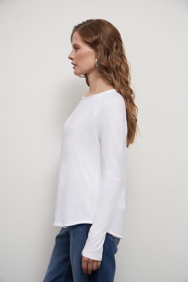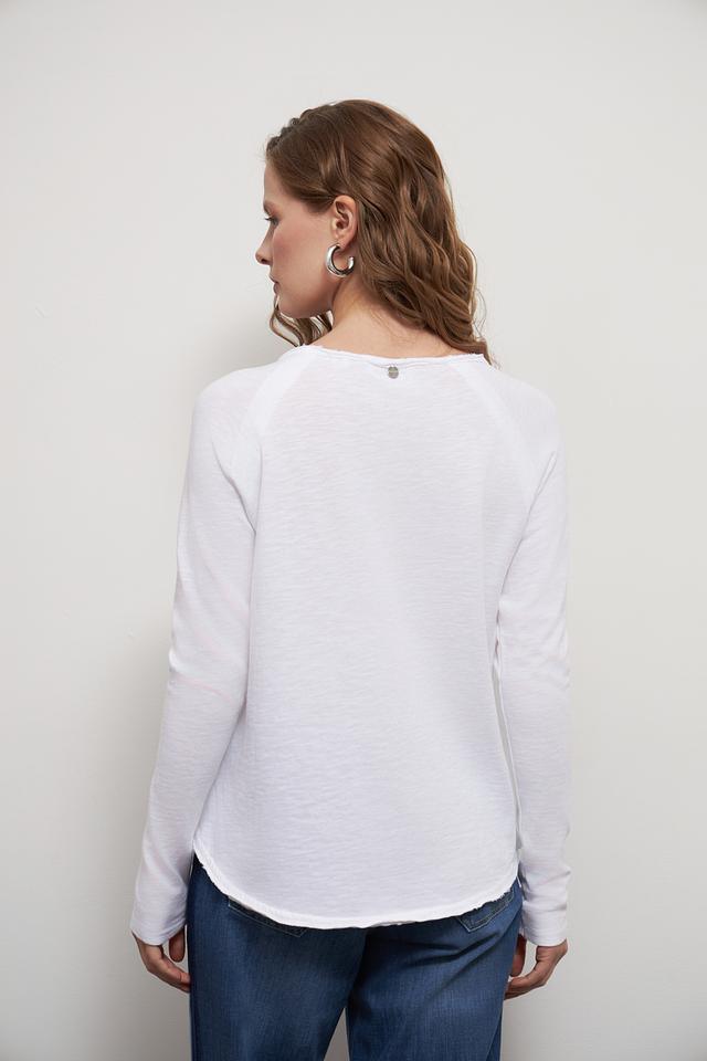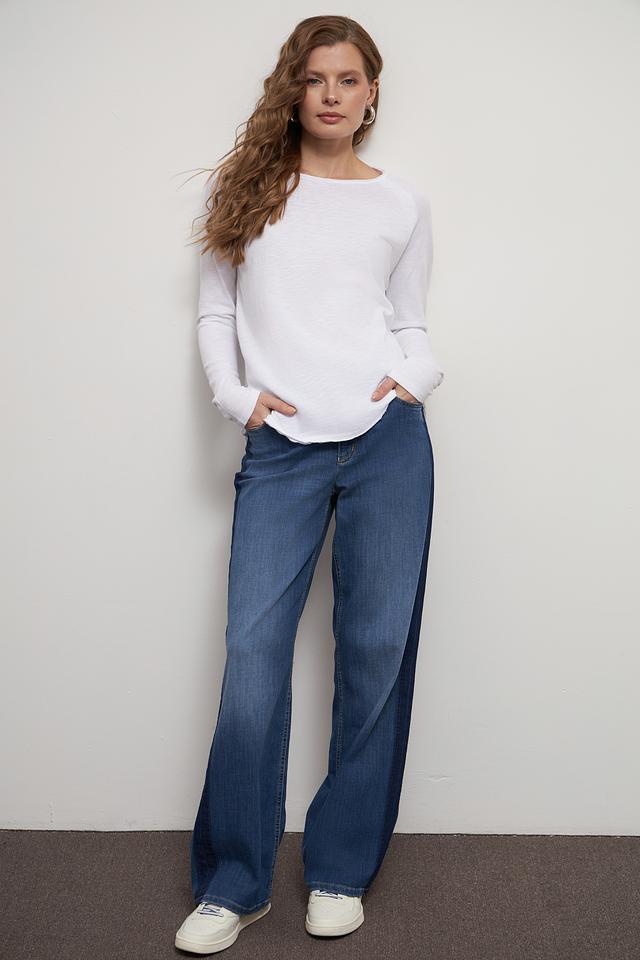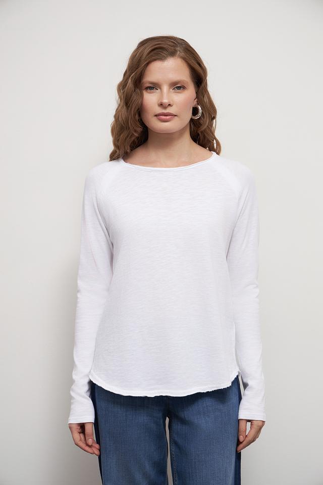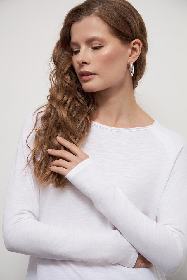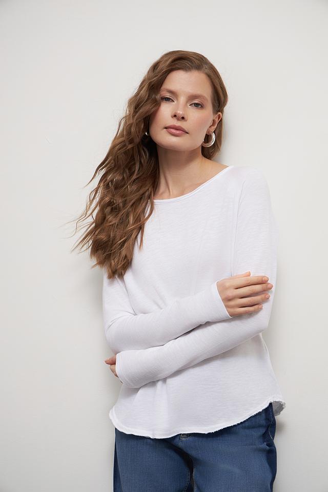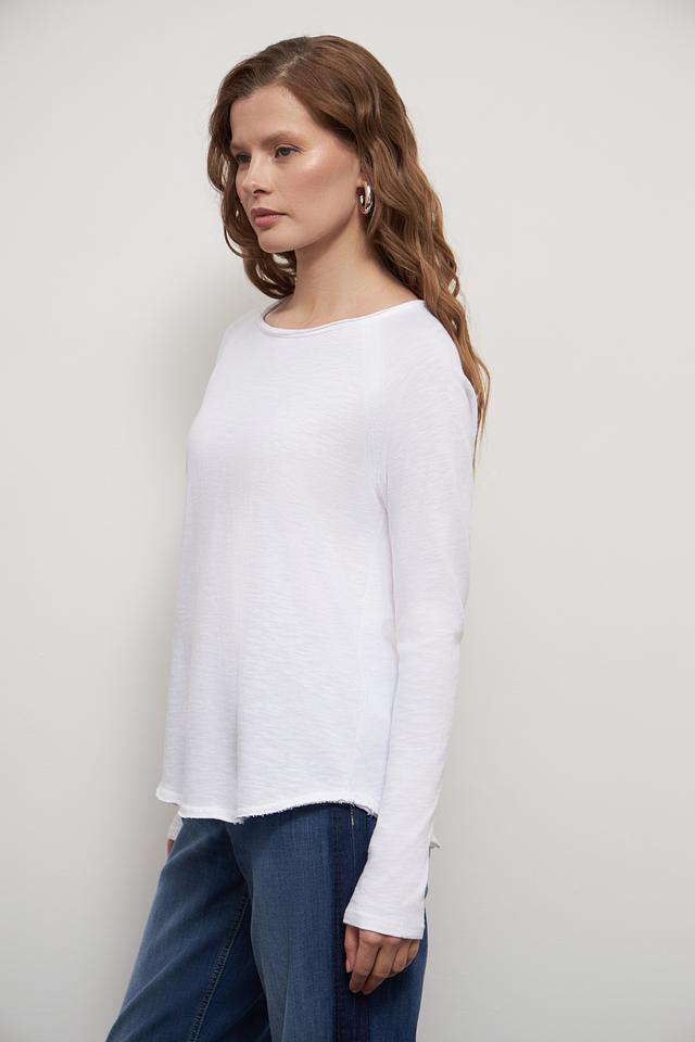 Лонгслив имеет прямой крой и круглый вырез горловины. Рукава длинные, классической длины. Особенностью модели является слегка неровный край низа изделия, что придает ему более расслабленный и непринужденный вид.