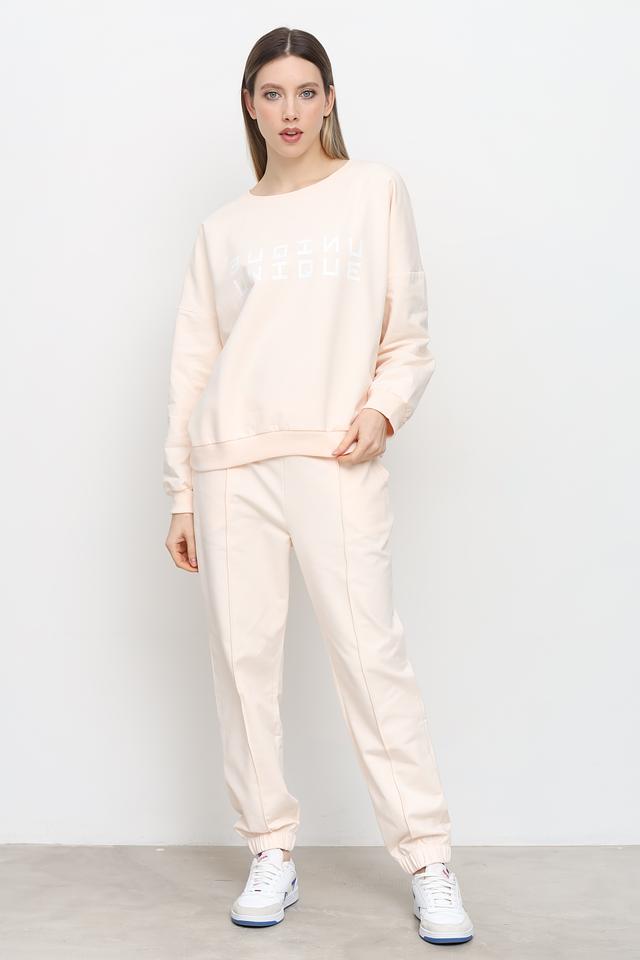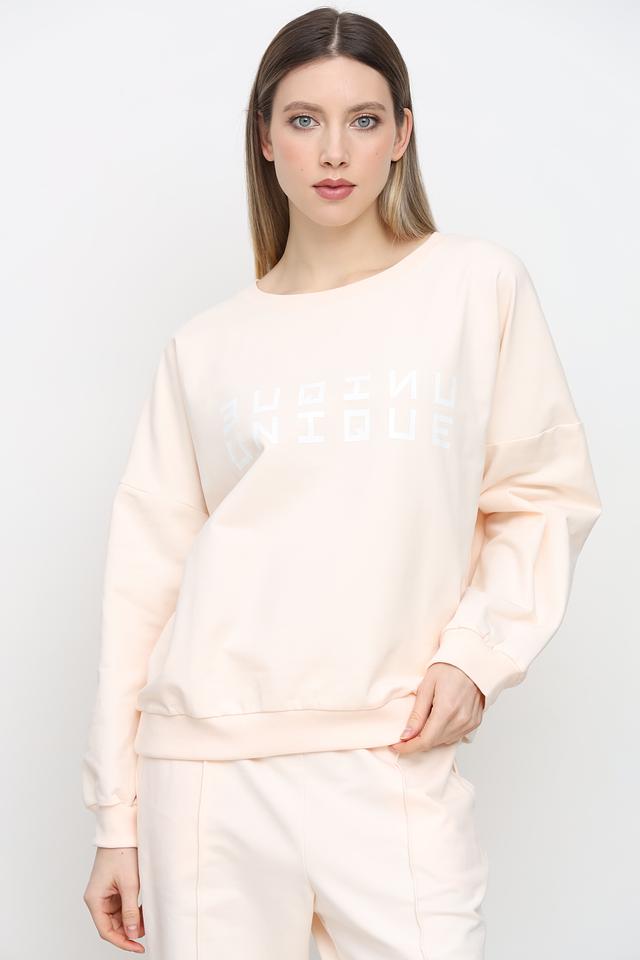 Лонгслив имеет свободный крой, круглый вырез горловины и длинные рукава. На передней части изделия расположен светлый принт с надписью "UNIQUE", который добавляет образу оригинальности.