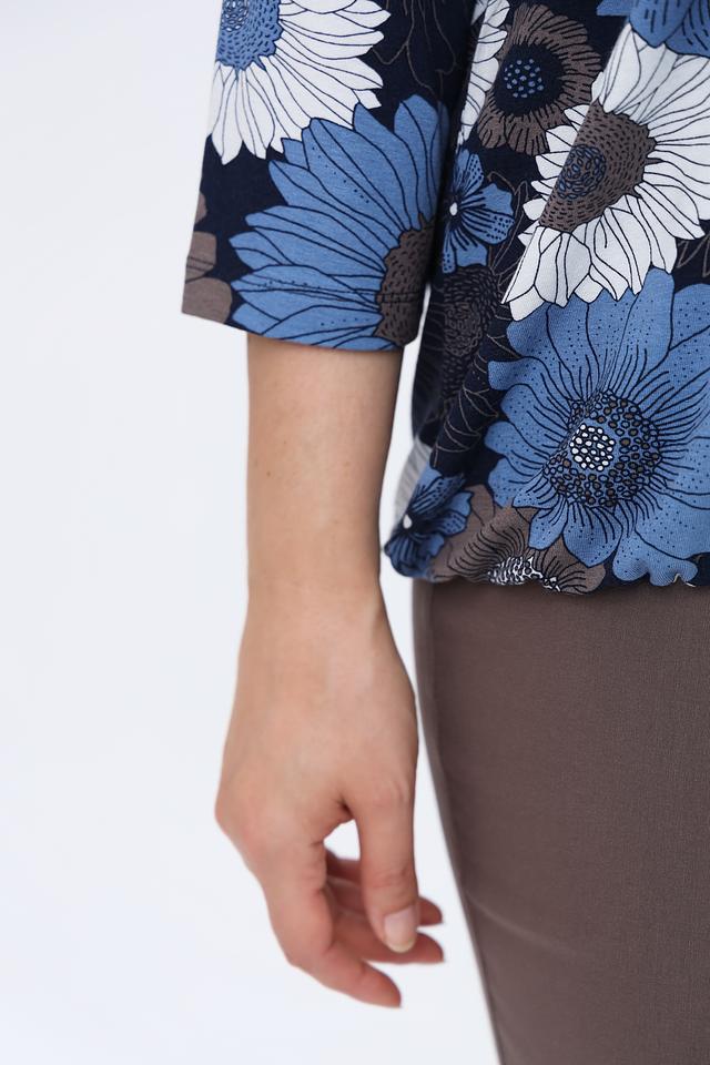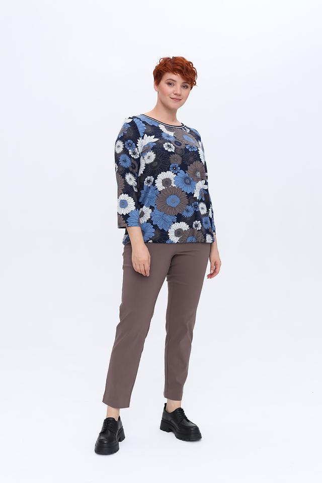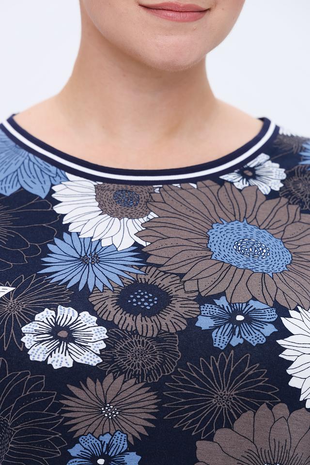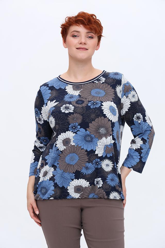 Основной цвет лонгслива – тёмно-синий, который служит идеальным фоном для яркого и красочного цветочного принта. Принт выполнен в различных оттенках синего, голубого, белого и серого, создавая эффектный и запоминающийся образ.