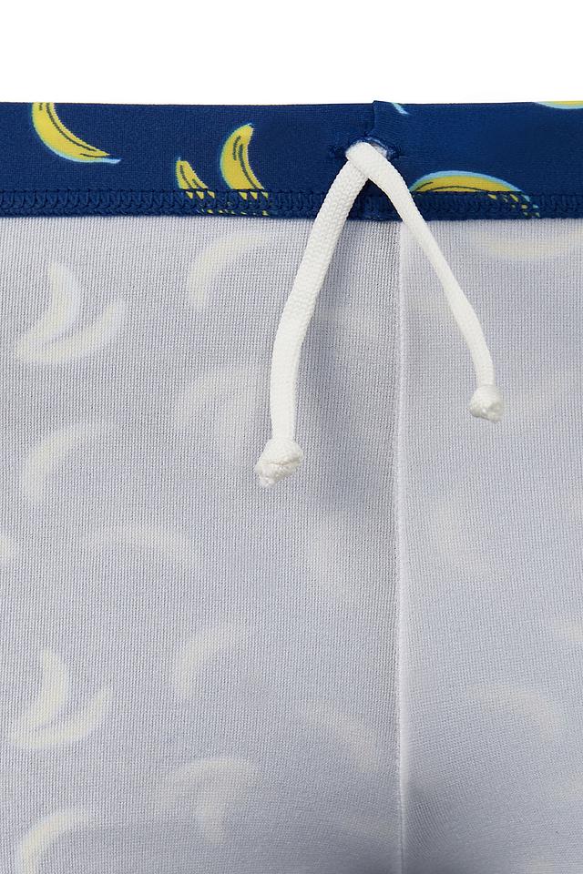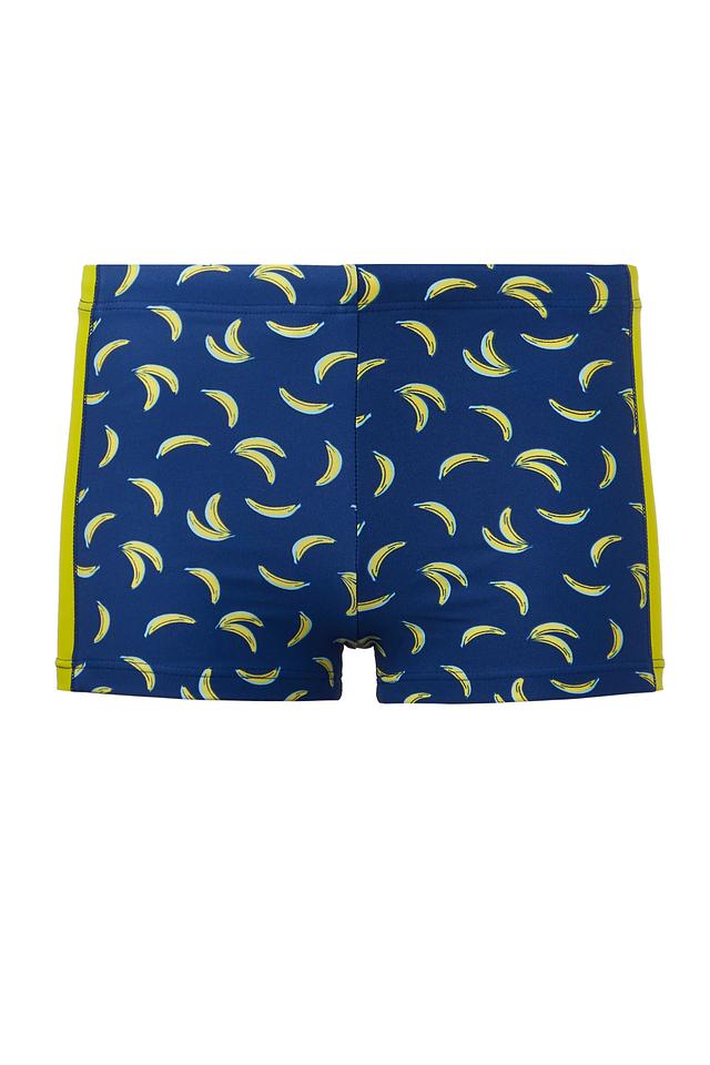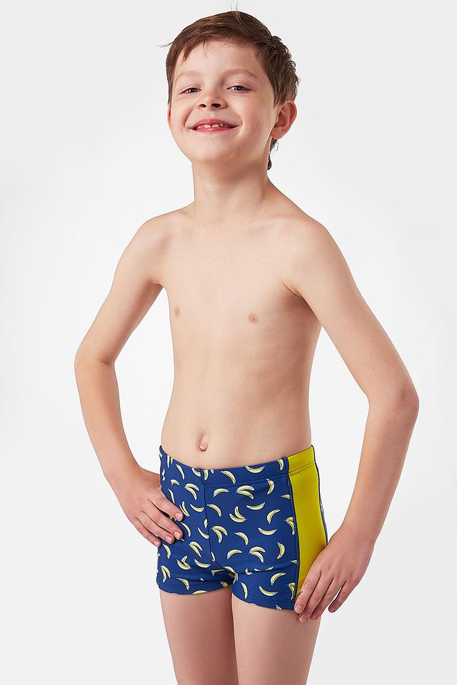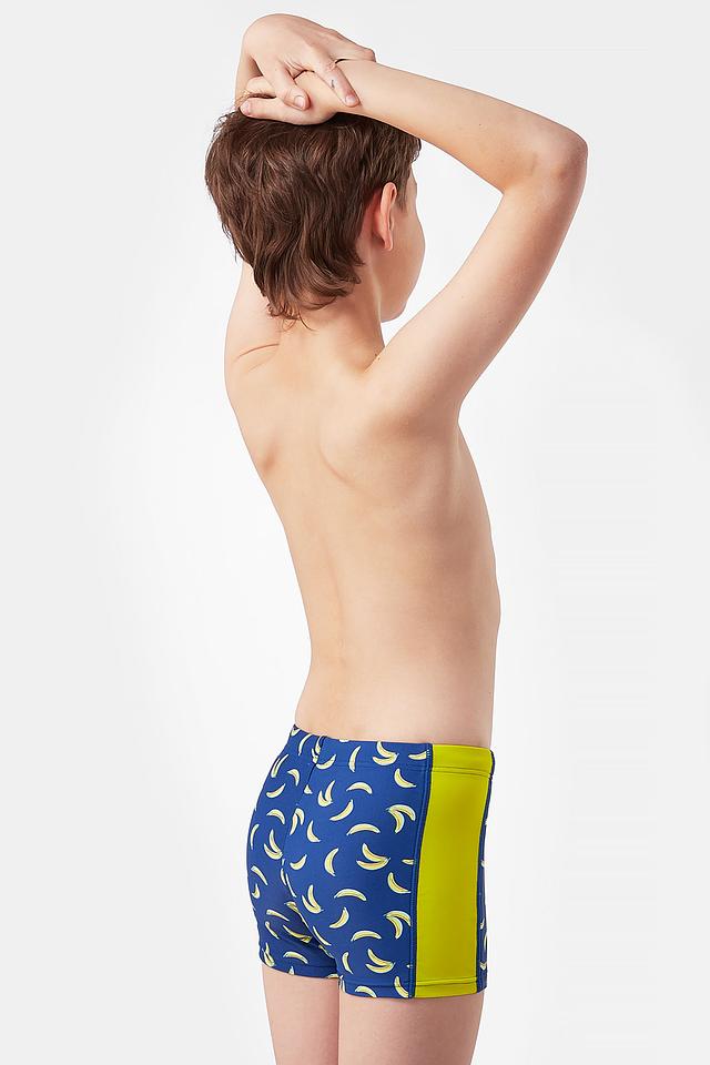 - Стильный дизайн: Яркий синий цвет в сочетании с контрастными жёлтыми бананами и однотонными боковыми вставками делает эти купальные шорты по-настоящему летними и привлекательными. Такой принт обязательно понравится юным модникам.