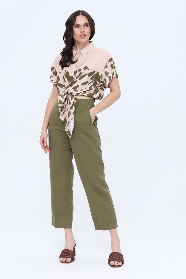 Рубашка имеет прямой крой, короткие рукава и классический отложной воротник. Завязки на талии позволяют подчеркнуть фигуру и создать более женственный силуэт. Модель дополнена накладными карманами на груди.