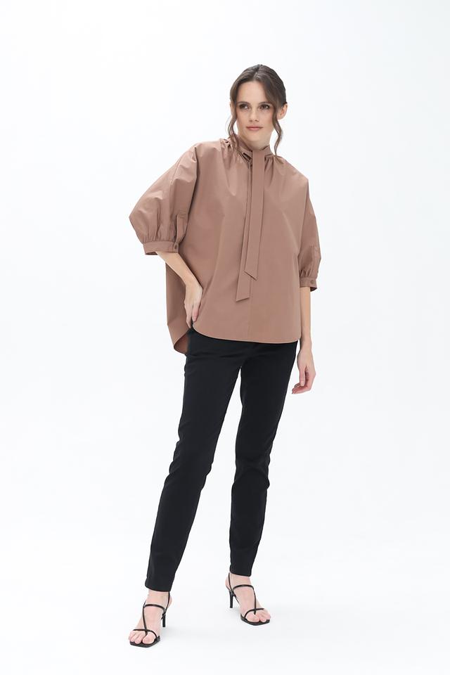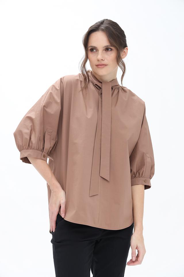 Бежевая блуза от Luisa Cerano с завязками на горловине. Модель выполнена из хлопка с добавлением эластана, имеет объёмные рукава и свободный крой. Состав: хлопок 93%, эластан 7%