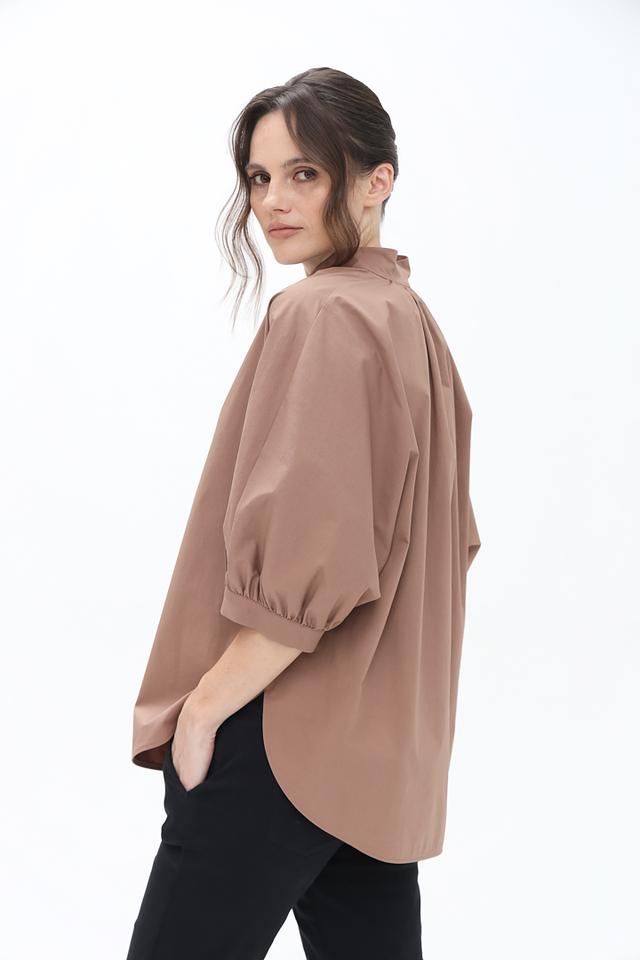 Блуза имеет свободный крой, который обеспечивает комфорт в носке, а рукава-фонарики добавляют образу романтичности. Завязки на горловине позволяют регулировать вырез и создавать различные силуэты.