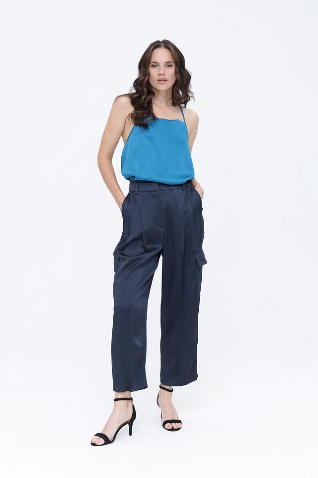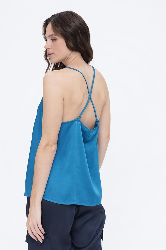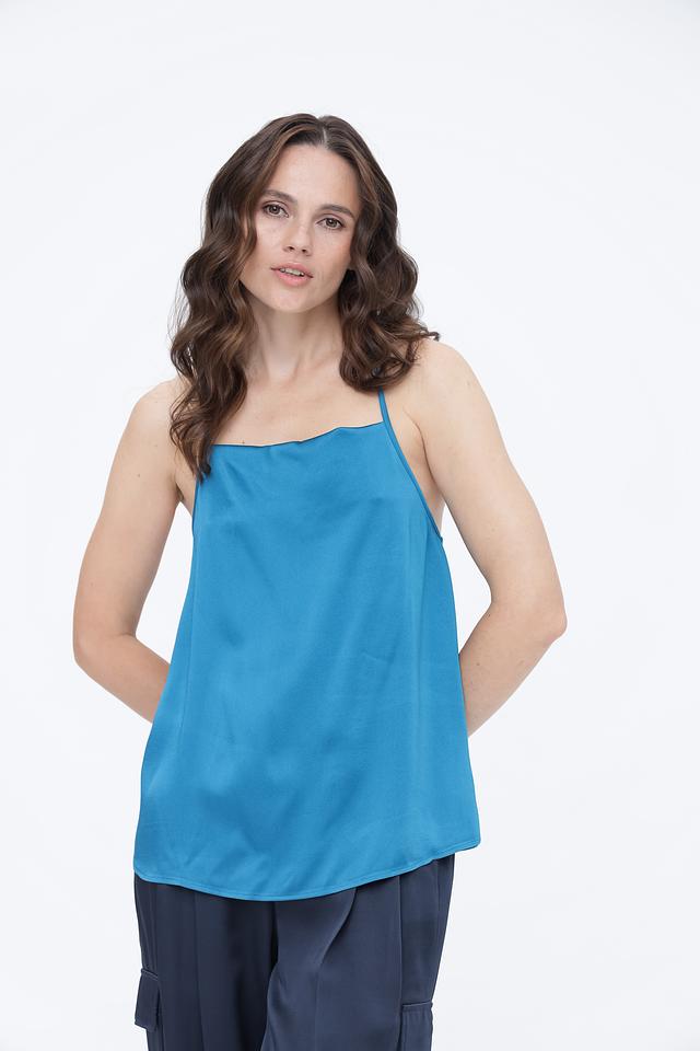 Топ имеет прямой крой и тонкие бретели, что делает его идеальным для теплых дней. Струящаяся ткань приятна к телу и обеспечивает комфорт при носке. Застежки отсутствуют, что упрощает процесс одевания.