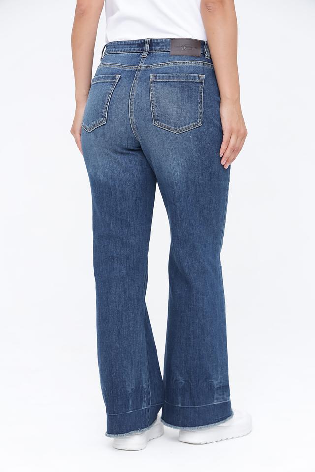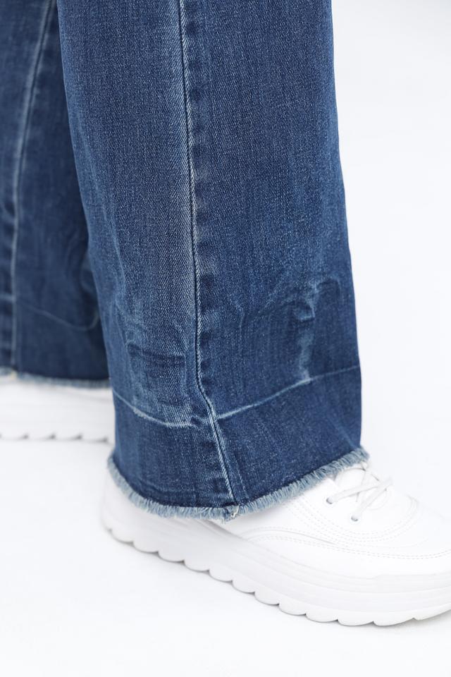 Джинсы имеют завышенную талию и широкие штанины, что обеспечивает комфортную посадку и создает модный силуэт. Ткань состоит из 99% хлопка и 1% эластана, благодаря чему джинсы приятны к телу, хорошо держат форму и позволяют свободно двигаться.