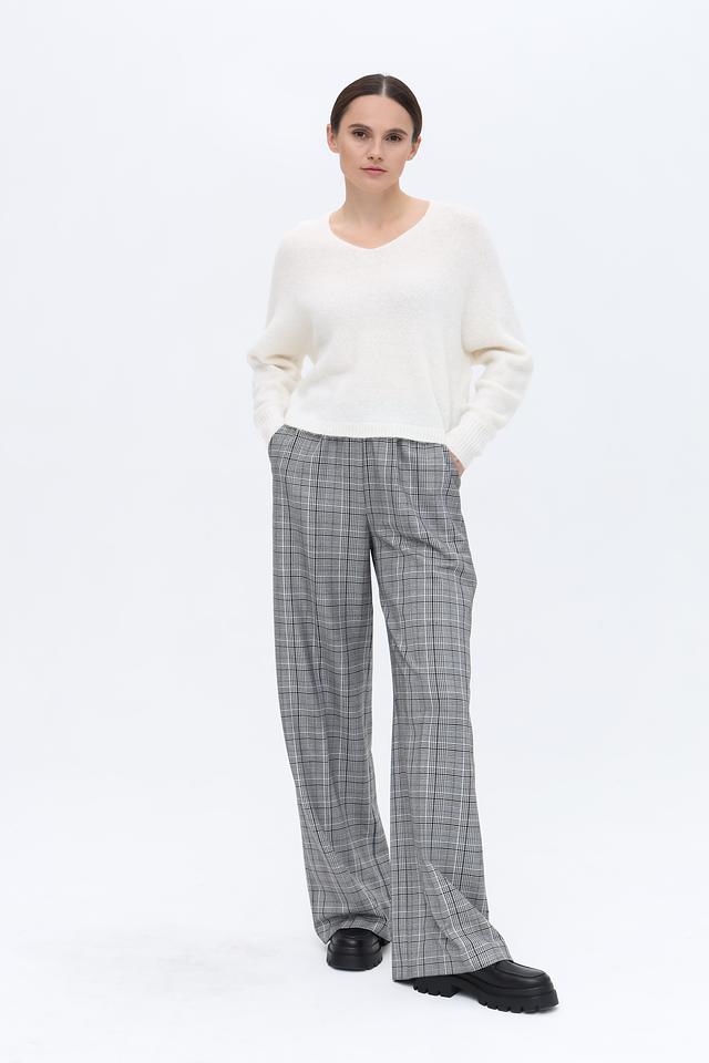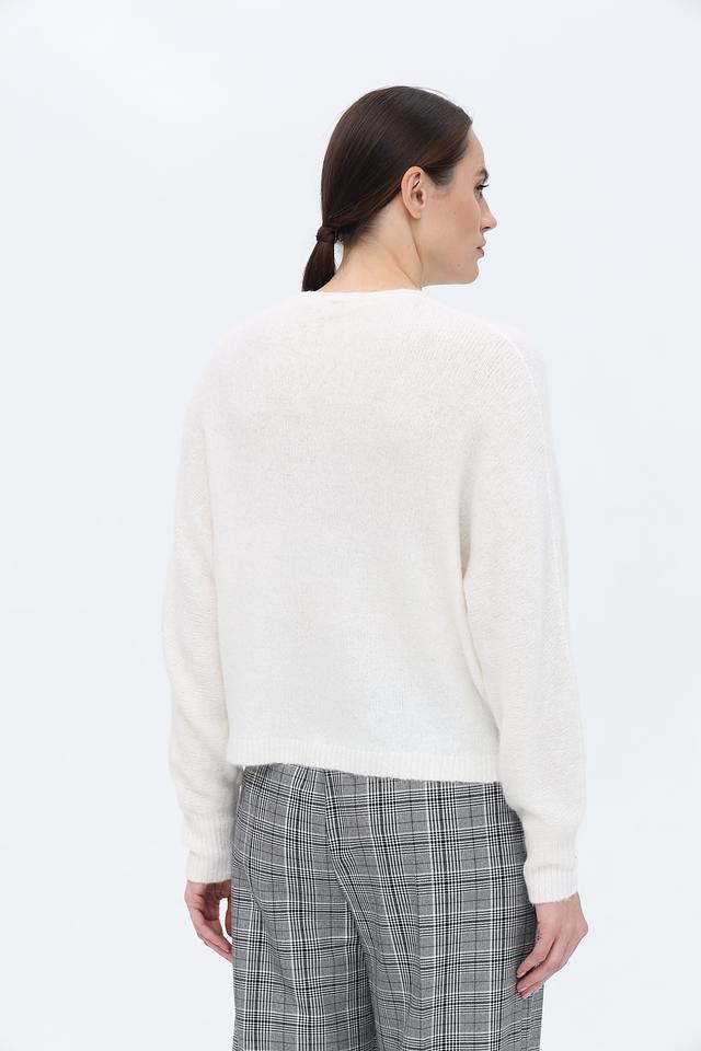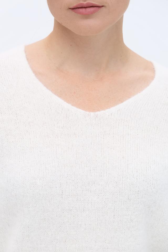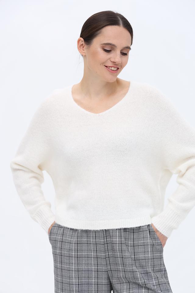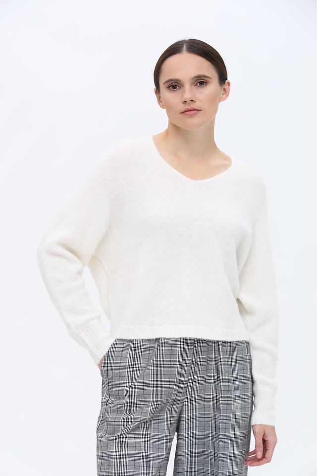 Пуловер имеет прямой крой и V-образный вырез, что делает его универсальным и подходящим для различных стилей. Молочный цвет придает изделию нежность и элегантность, позволяя легко сочетать его с другими элементами гардероба.