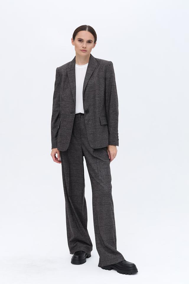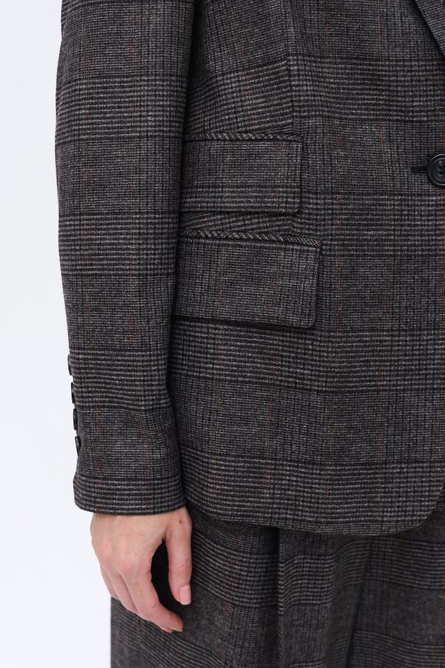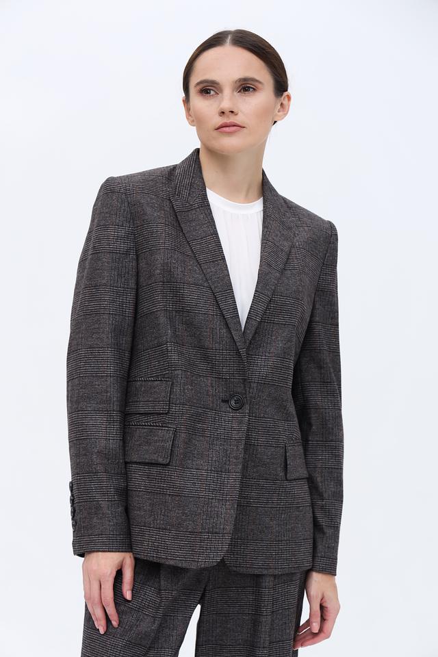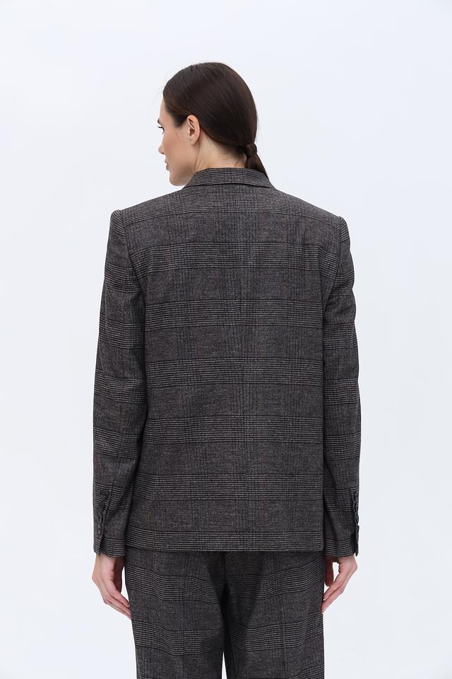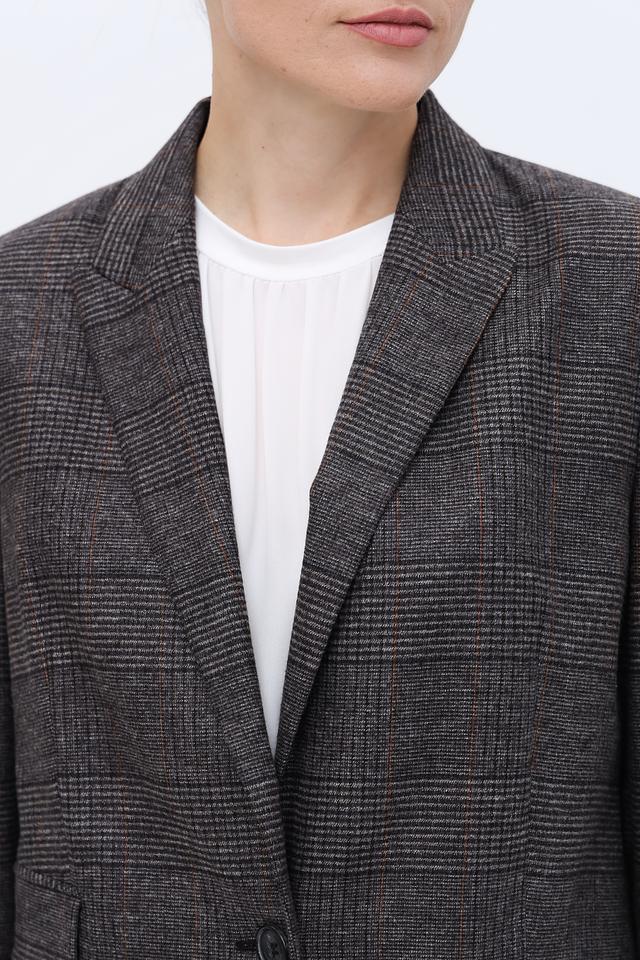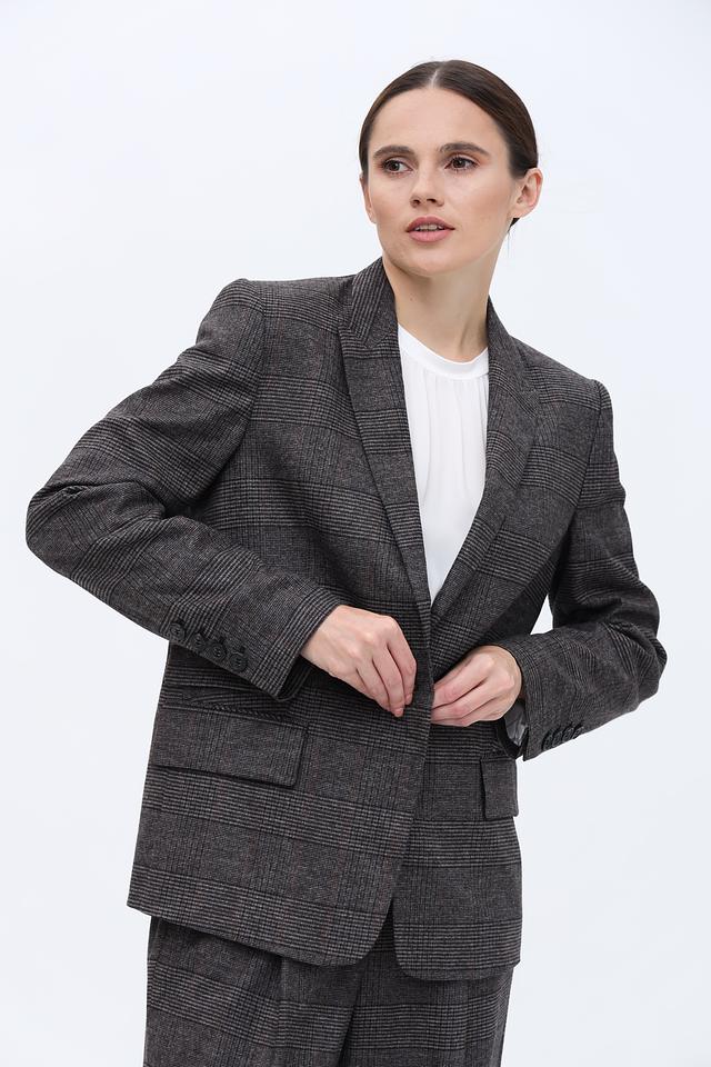 Основной цвет жакета – серый, но благодаря клетчатому рисунку в тонких черных и коричневых линиях, он выглядит интересно и необычно. Этот жакет станет отличным дополнением к вашему гардеробу и позволит создавать разнообразные стильные образы.