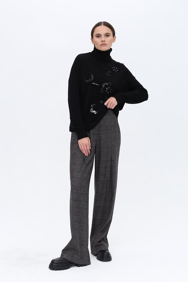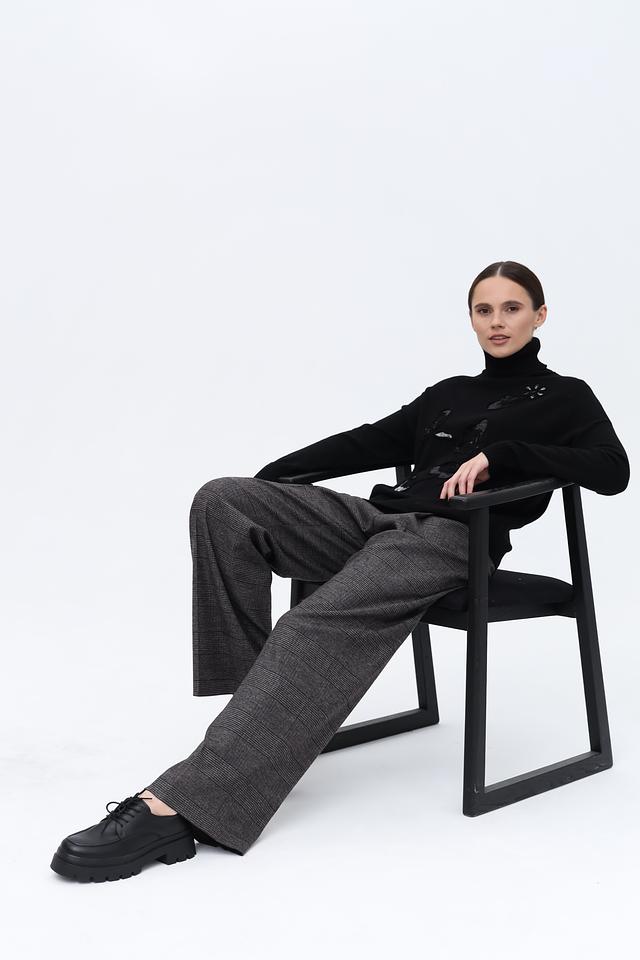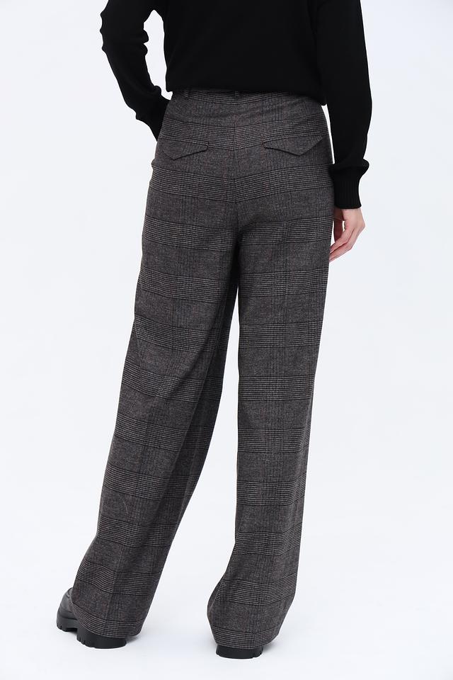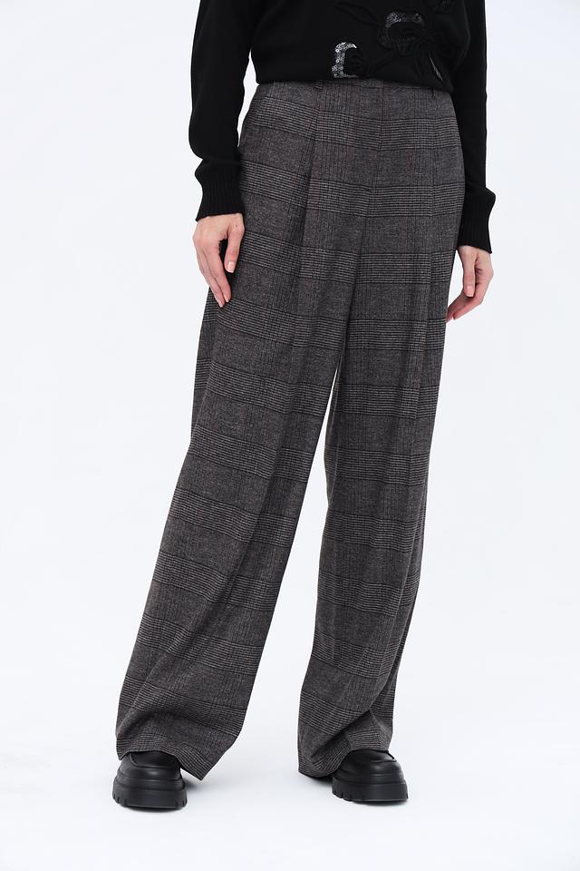 Брюки имеют прямой крой, который обеспечивает свободу движений и комфорт в носке. Высокая посадка визуально удлиняет ноги и подчеркивает талию. Наличие складок придает брюкам элегантный и утонченный вид.