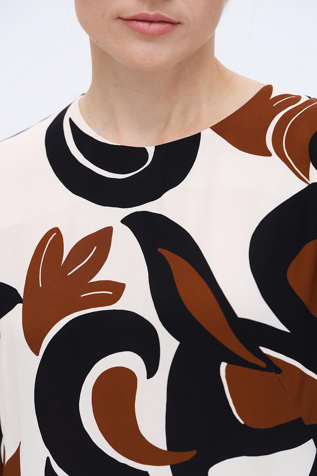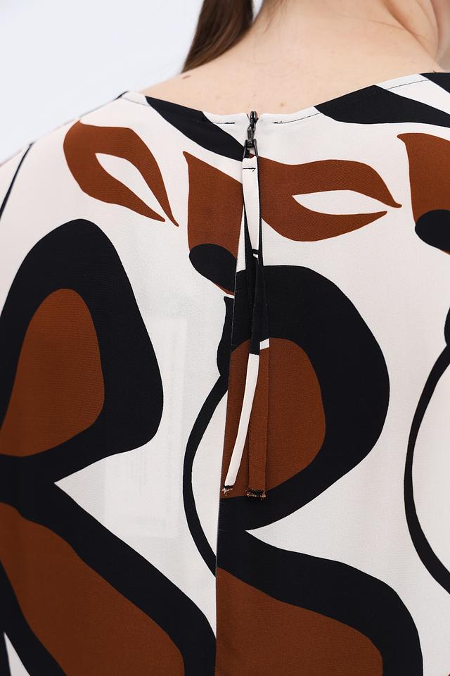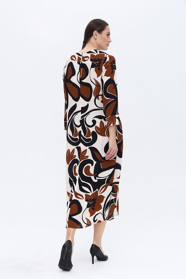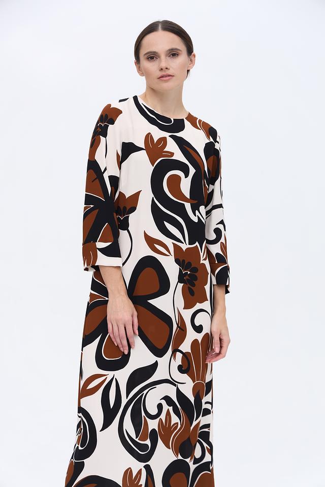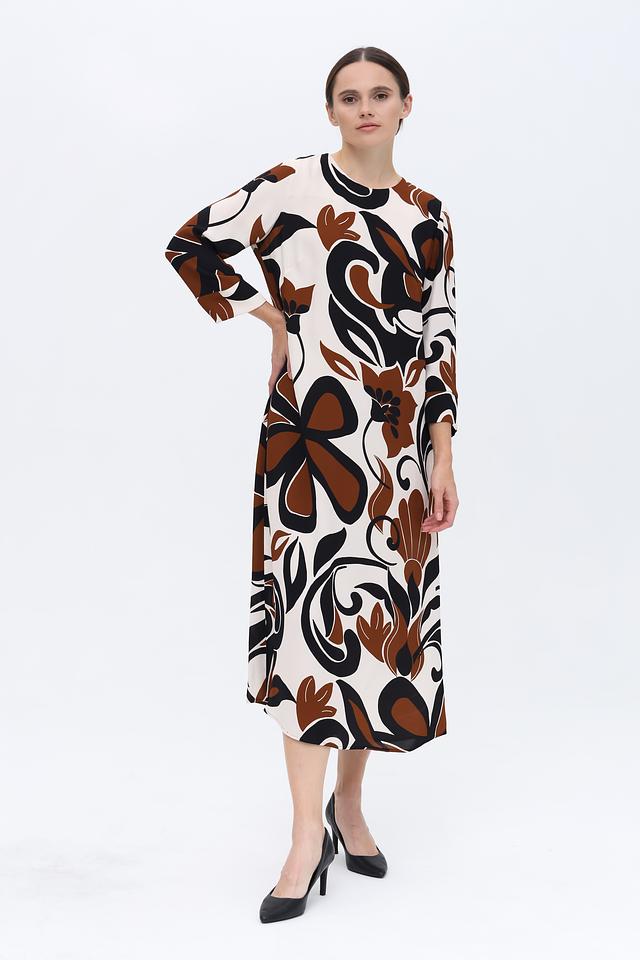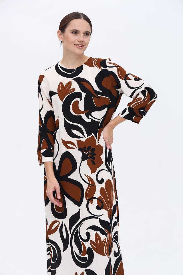 Основной цвет платья – кремовый, а яркий акцент расставлен благодаря оригинальному цветочному принту в коричневых и черных тонах. Принт покрывает всю поверхность платья, создавая запоминающийся и эффектный образ.