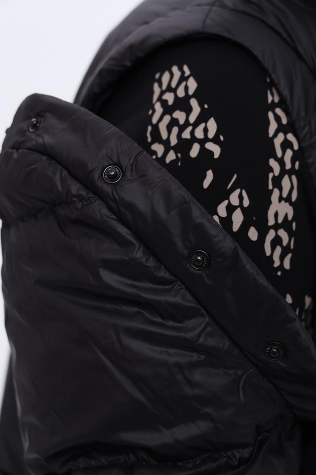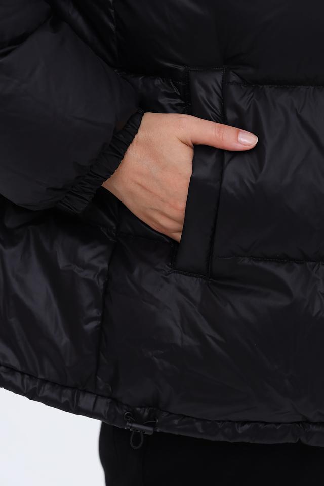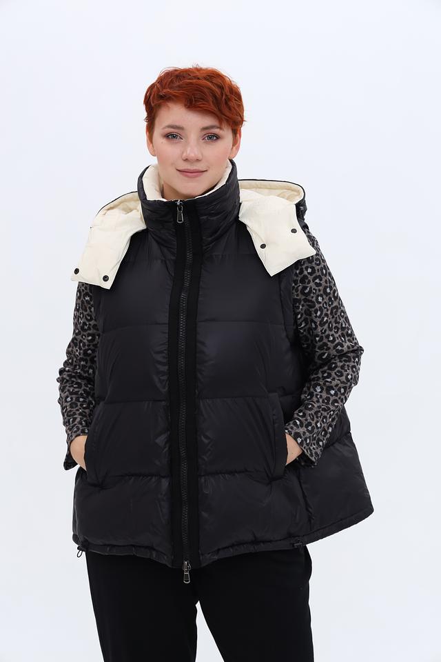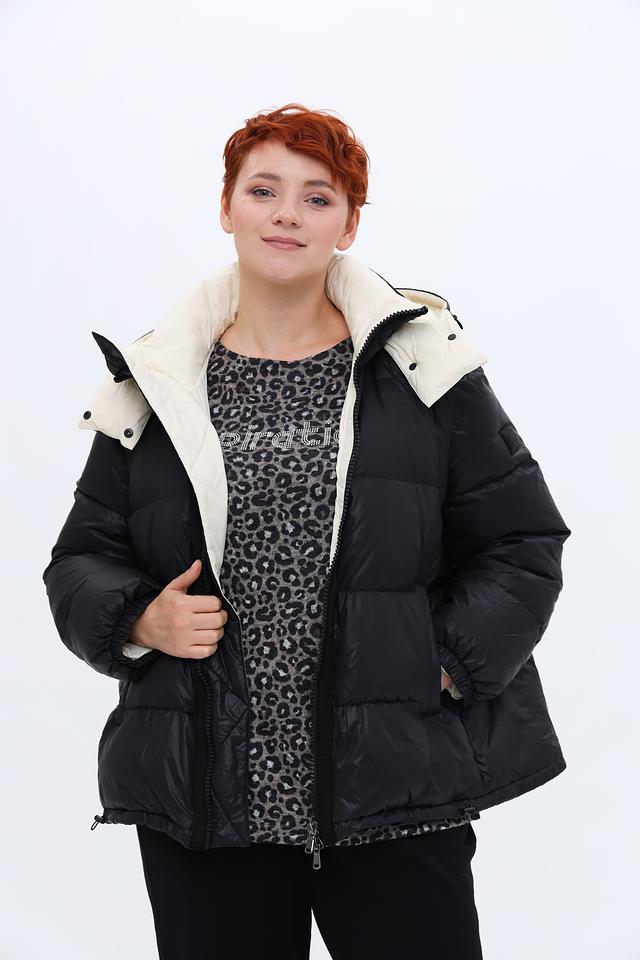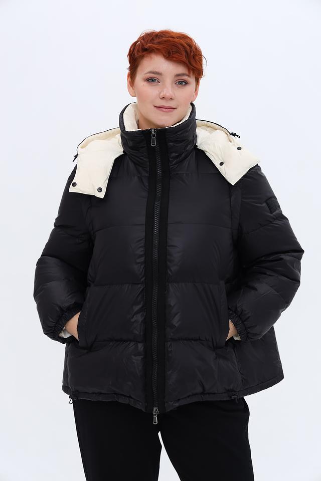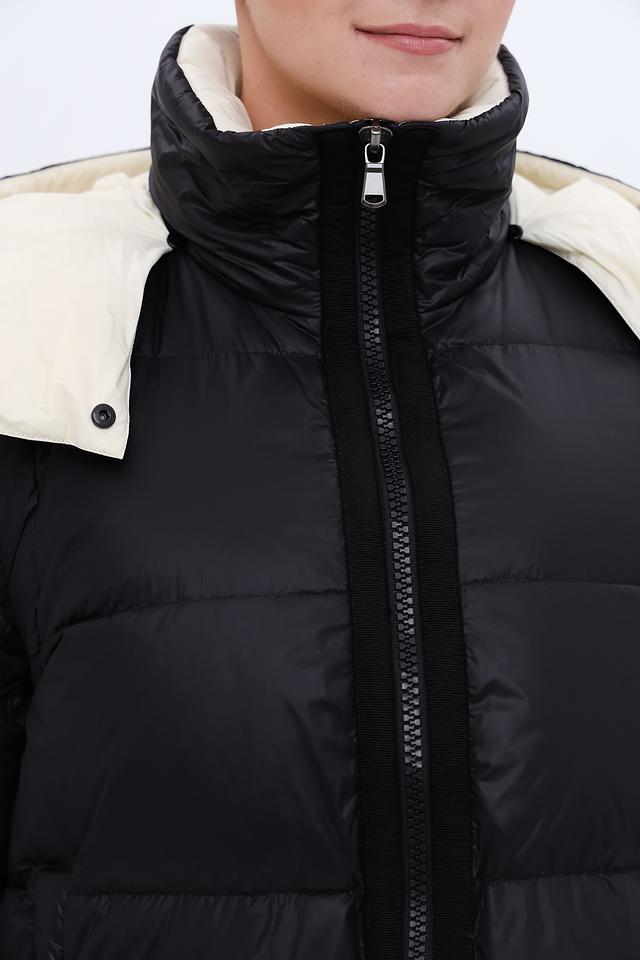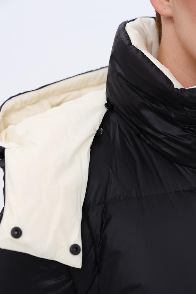 Куртка имеет стёганую текстуру, которая придает ей объём и визуальный интерес. Капюшон и внутренняя часть куртки отделаны кремовым материалом, создавая контрастный и элегантный эффект. Застежка-молния обеспечивает удобство и надежность.