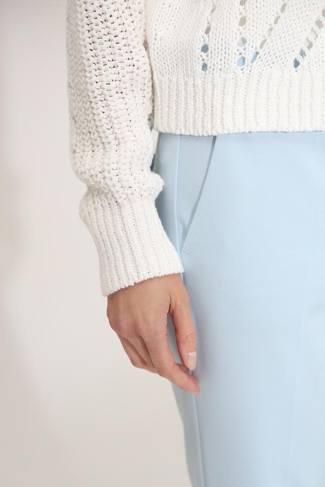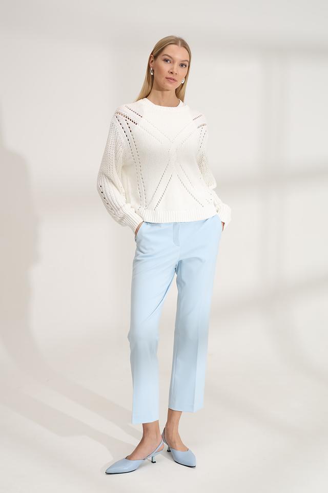Пуловер имеет свободный крой, который не сковывает движения и позволяет создать расслабленный образ. Ажурный узор придает изделию легкость и изысканность, делая его идеальным для создания как повседневных, так и более нарядных образов.