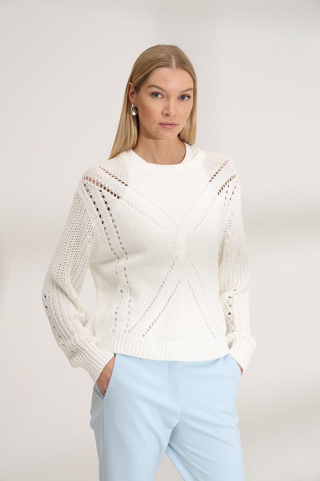 Белый пуловер от Luisa Cerano выполнен из мягкого хлопка с добавлением полиамида. Модель имеет ажурный узор и свободный крой, что обеспечивает комфорт и стильный вид. Состав: хлопок 78%, полиамид 22%