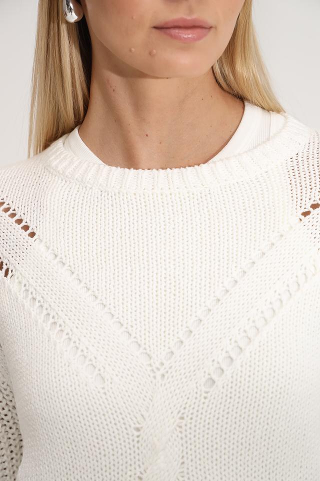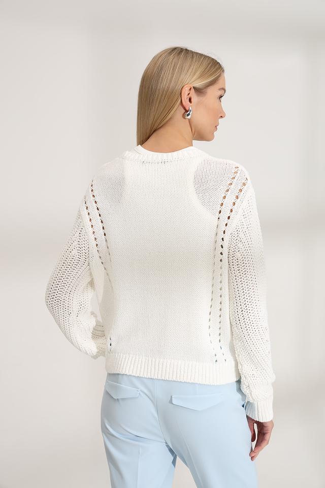 Круглый вырез горловины и длинные рукава делают этот пуловер универсальным и подходящим для любой погоды. Белый цвет легко сочетается с другими элементами гардероба, позволяя создавать разнообразные стильные комбинации. Пуловер идеально подойдет для ношения с джинсами, брюками или юбками.