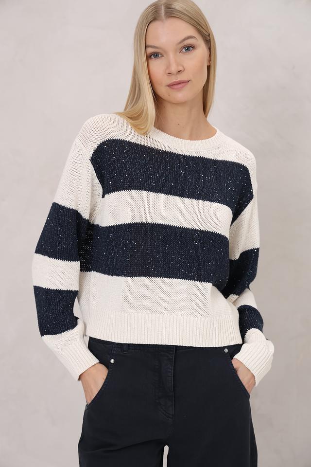 Этот пуловер от Luisa Cerano станет отличным дополнением к вашему гардеробу. Он выполнен в классическом стиле с горизонтальной полоской, сочетающей кремовый и тёмно-синий цвета.