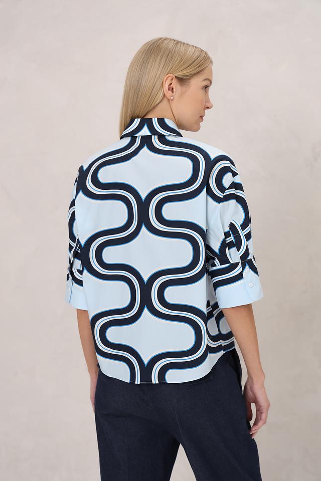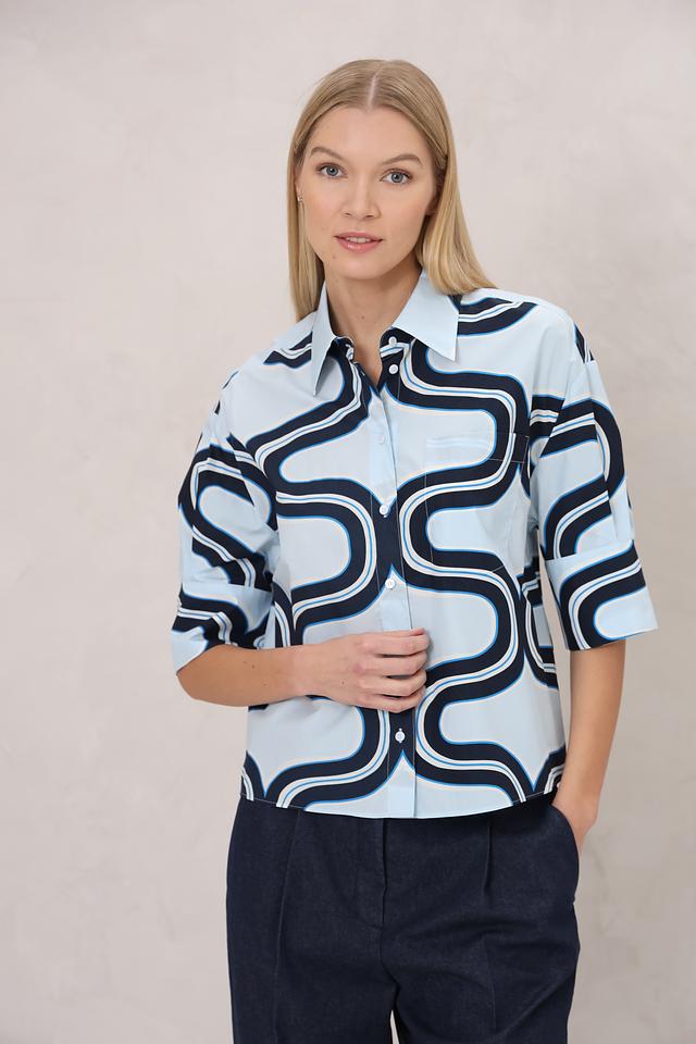 Женская рубашка Luisa Cerano голубого цвета с оригинальным волнистым принтом. Модель с коротким рукавом и классическим воротником станет стильным дополнением к вашему гардеробу. Состав: хлопок 100%