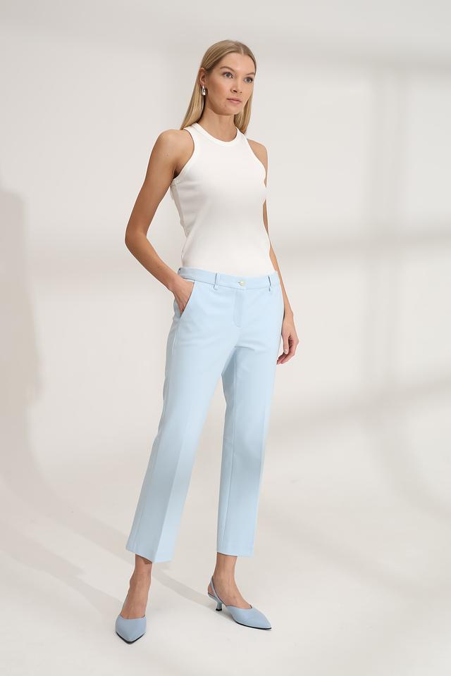 Топ имеет облегающий силуэт и круглый вырез горловины. Изготовлен из высококачественного хлопка с добавлением эластана, что обеспечивает комфорт и свободу движений. Ткань приятна на ощупь и хорошо держит форму.
