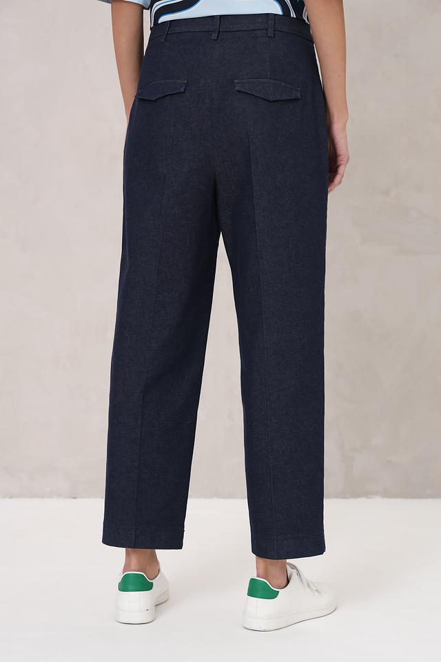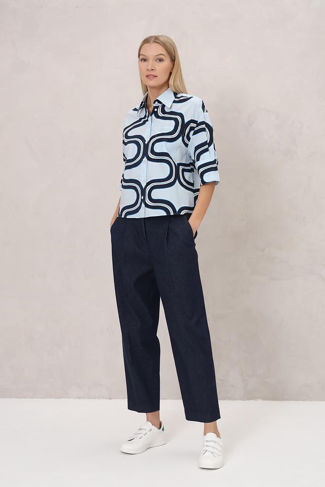 Брюки имеют прямой крой, высокую посадку и широкие штанины, что обеспечивает свободу движений и комфорт в течение всего дня. Передняя часть брюк оформлена защипами, придающими им более элегантный и утонченный вид. Застежка на молнию и пуговицу, а также наличие задних карманов с клапанами.