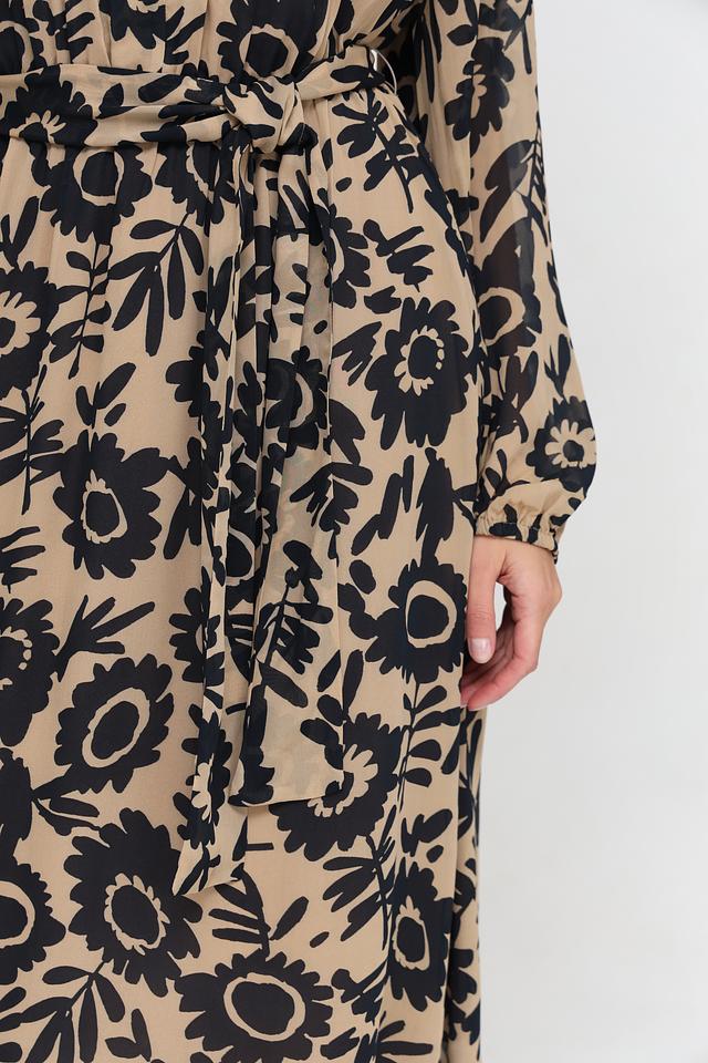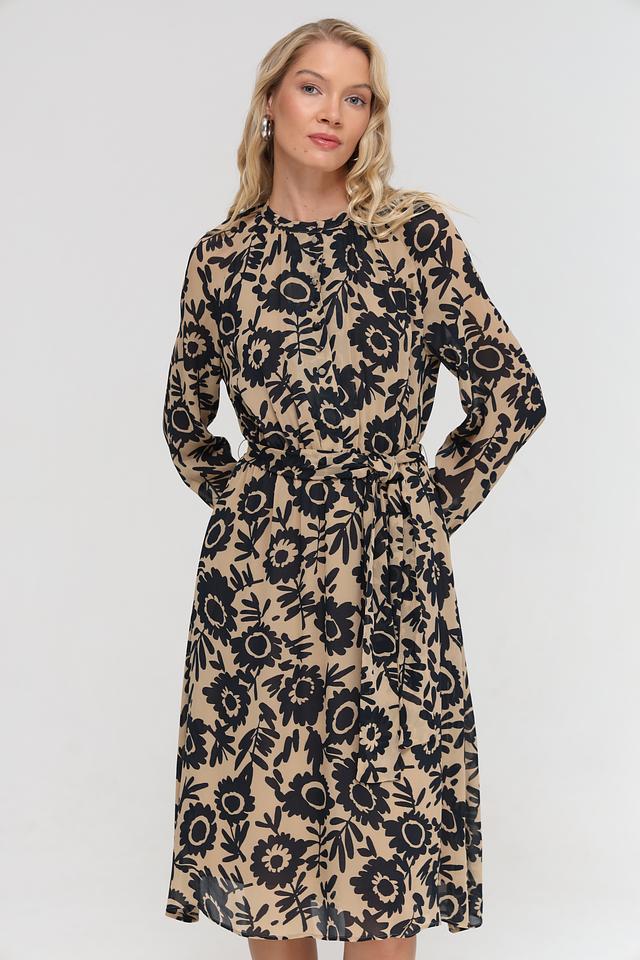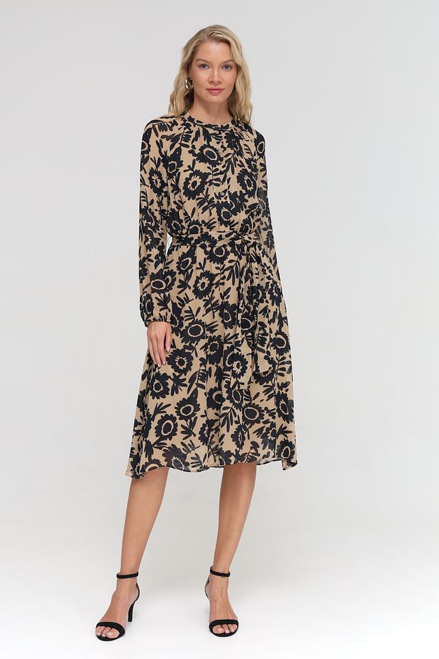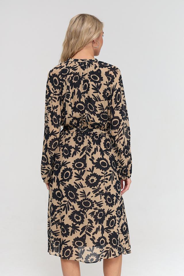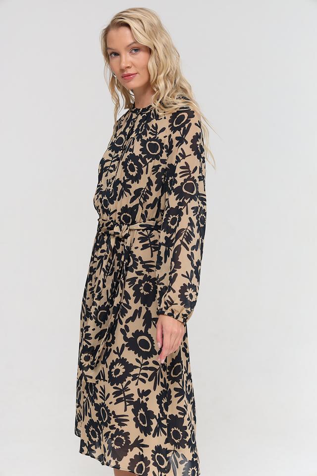 Платье имеет длину до колена, длинные рукава и круглый вырез горловины. За счет пояса, который входит в комплект, можно подчеркнуть талию и создать более женственный силуэт. Принт состоит из крупных, стилизованных цветов, что делает платье ярким и запоминающимся.