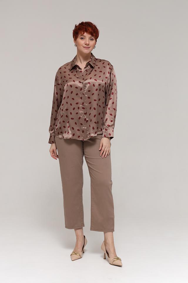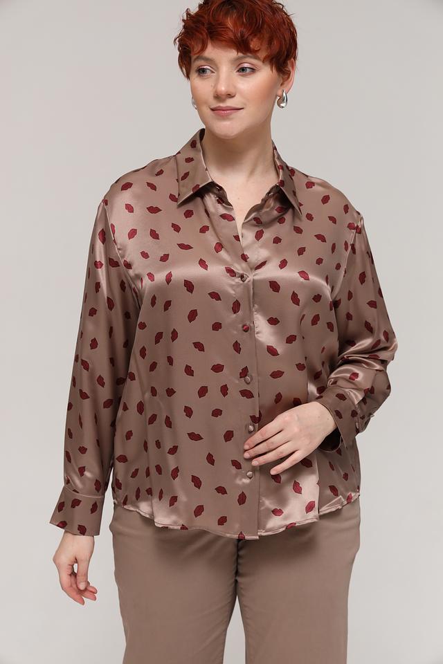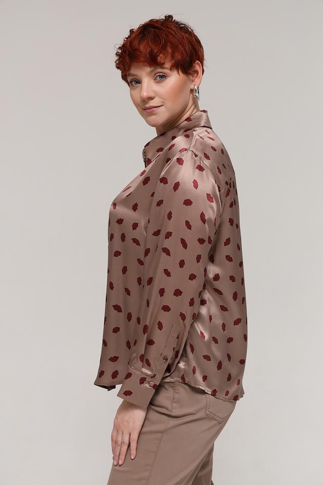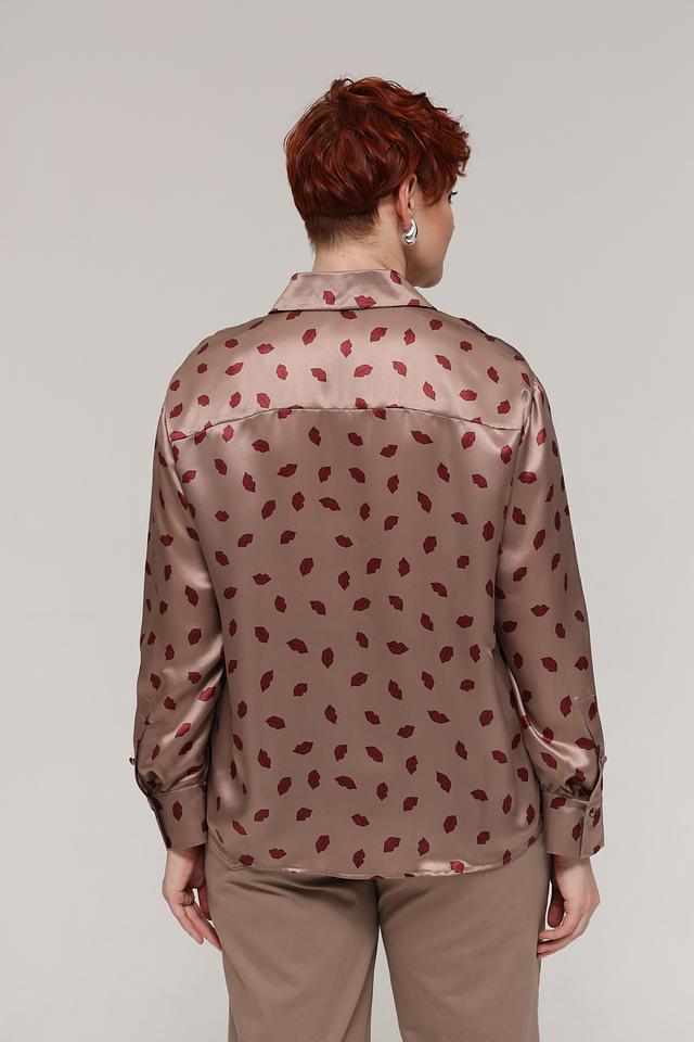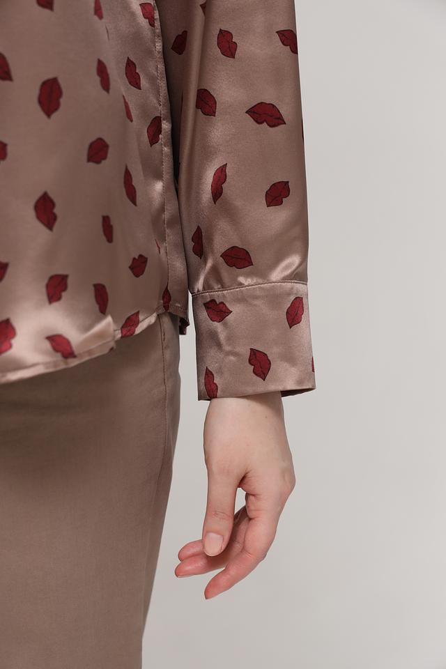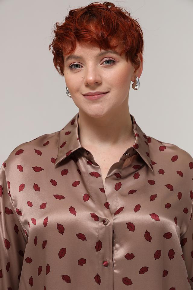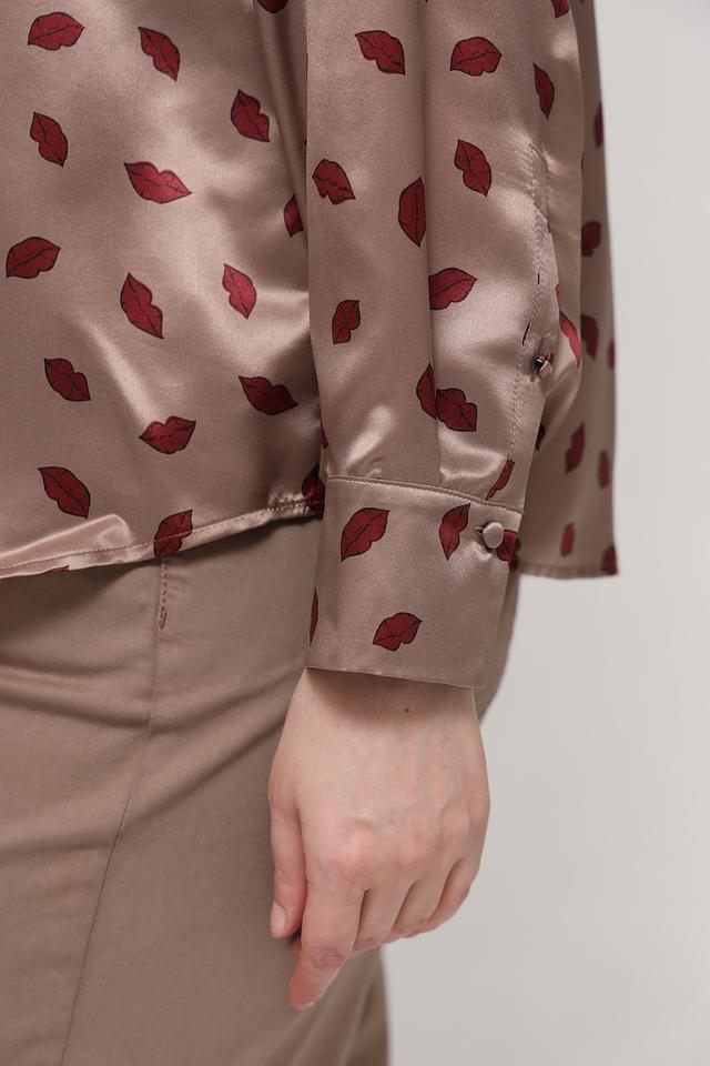 Блуза имеет классический крой с длинными рукавами и отложным воротником. Её украшает оригинальный принт в виде губ, выполненный в бордовом цвете на бежевом фоне. Эта деталь придает блузе игривость и индивидуальность.