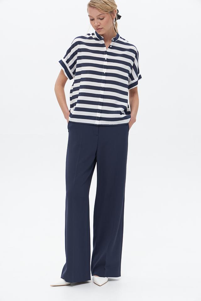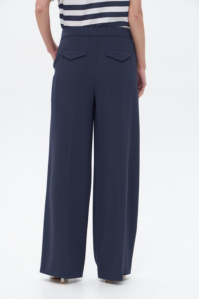 Брюки имеют прямой крой и широкие штанины, что обеспечивает свободу движений и создает изысканный силуэт. Высокая посадка подчеркивает талию и визуально удлиняет ноги. Модель дополнена боковыми карманами и задними карманами с клапанами.
