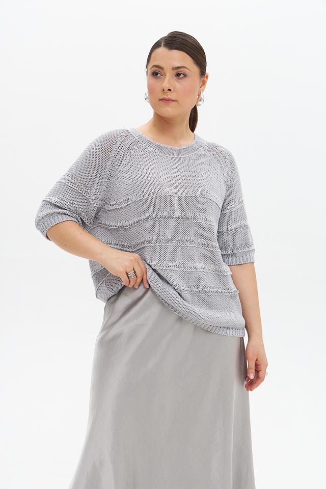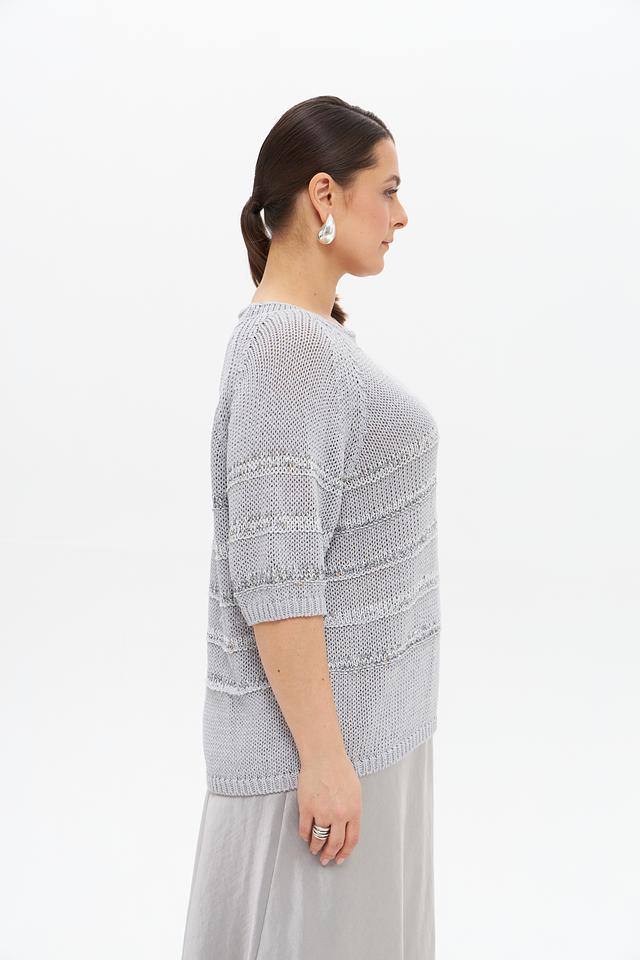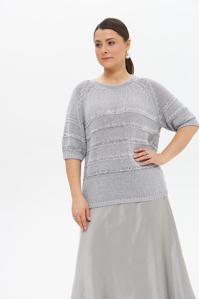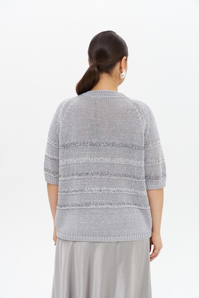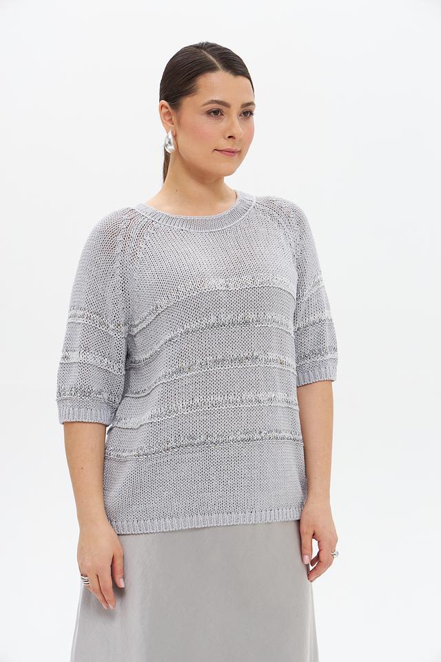 Серый пуловер от Luisa Cerano с коротким рукавом и оригинальным узором. Изделие выполнено из смесовой ткани, сочетающей в себе лен, хлопок и полиамид, что обеспечивает комфорт и воздухопроницаемость. Состав: лен 33%, хлопок 30%, полиамид 25%, полиэстер 6%, вискоза 5%