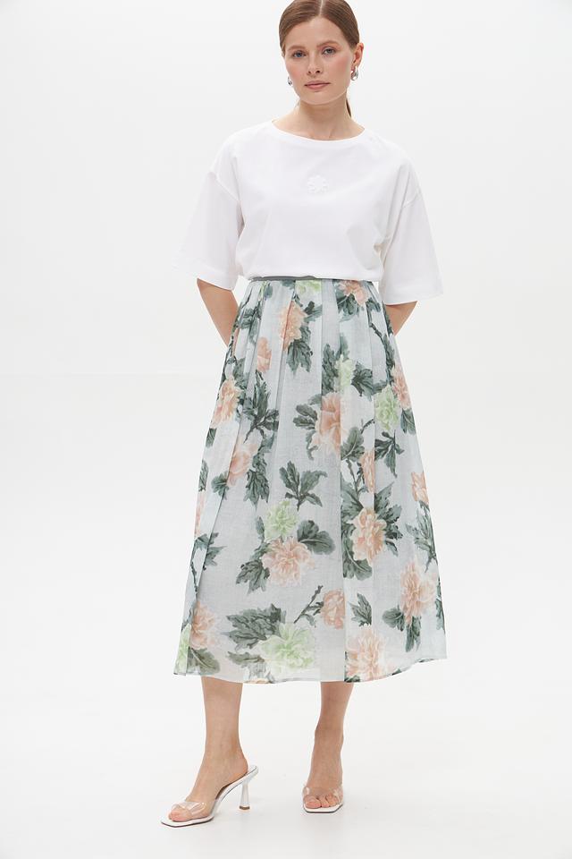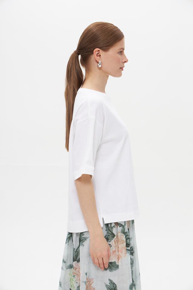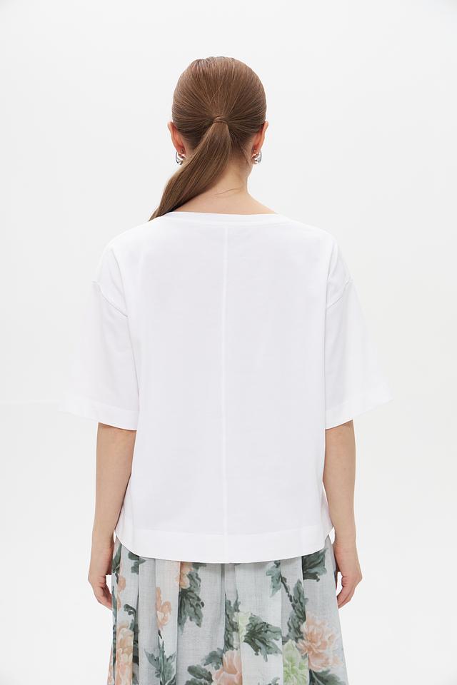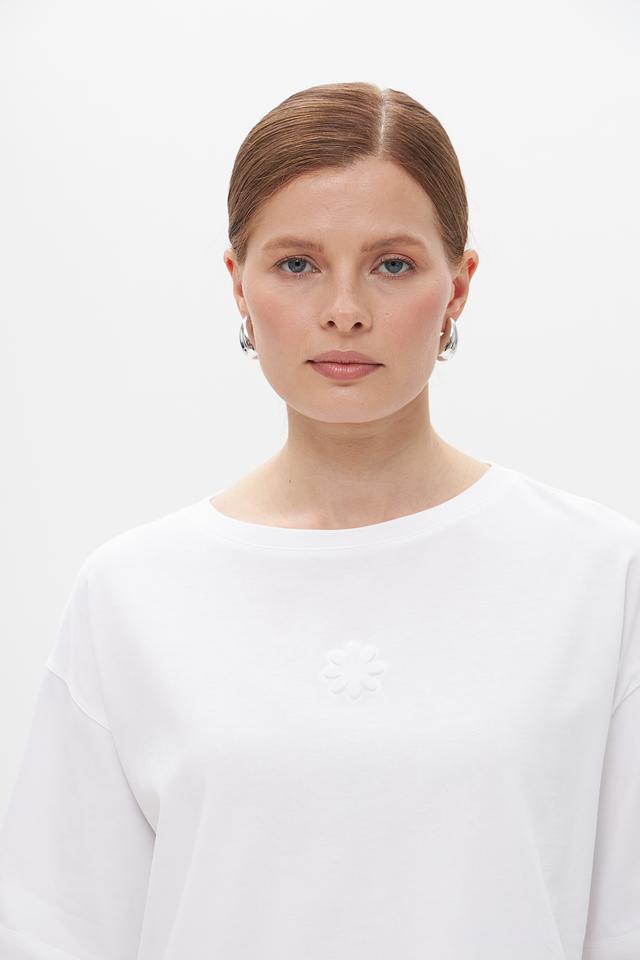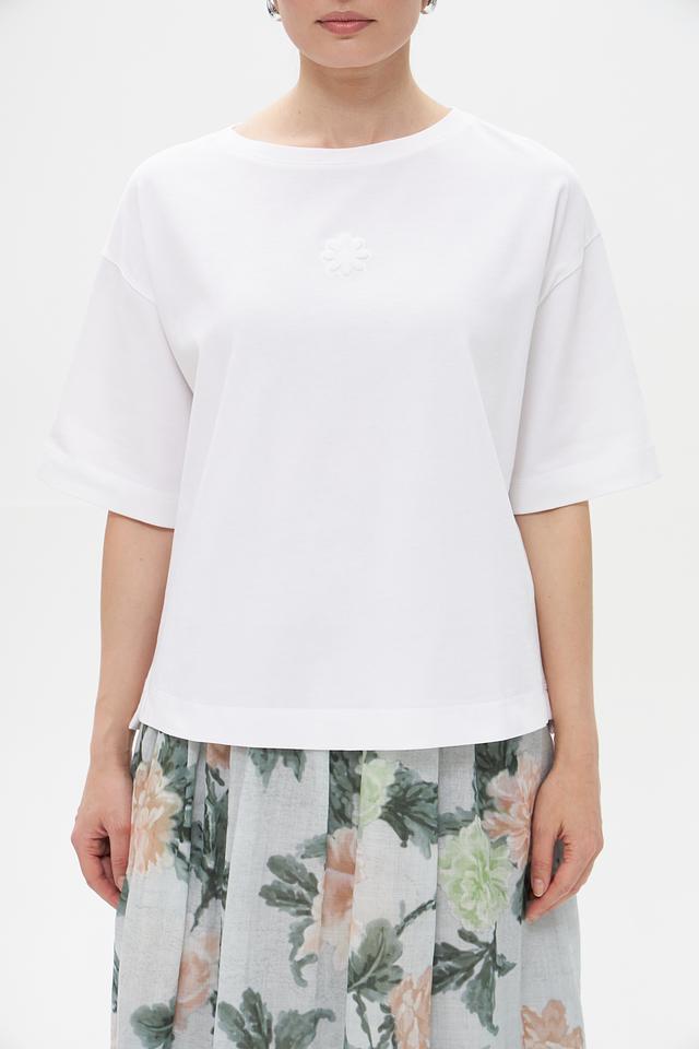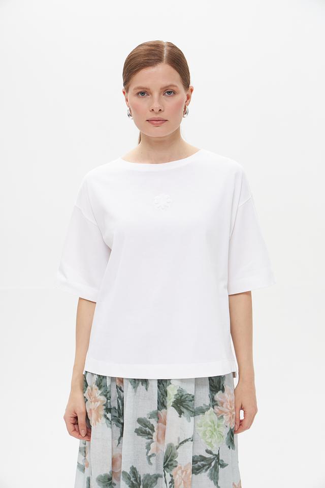 Особенностью данной модели является деликатная вышивка на груди, которая придает ей элегантный и женственный вид. Прямой крой футболки позволяет создать расслабленный, но стильный образ.