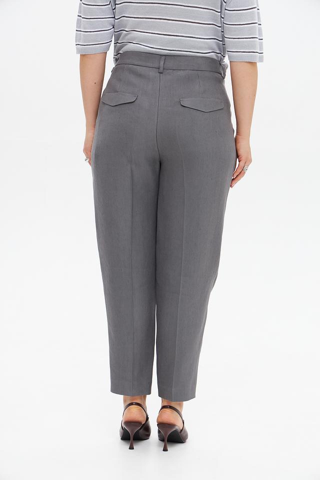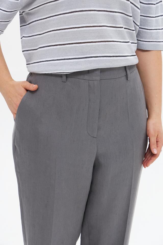 Серые брюки от Luisa Cerano — элегантная модель прямого кроя с застежкой на молнию и пуговицу. Изготовлены из смесовой ткани с добавлением льна, что обеспечивает комфорт и воздухопроницаемость. Состав: лен 53%, луоселл 47%