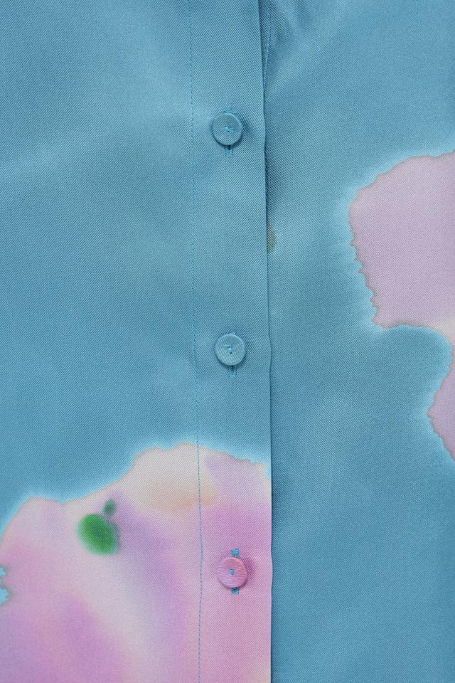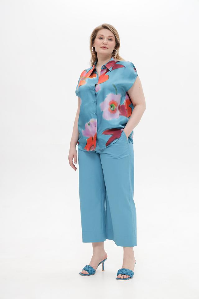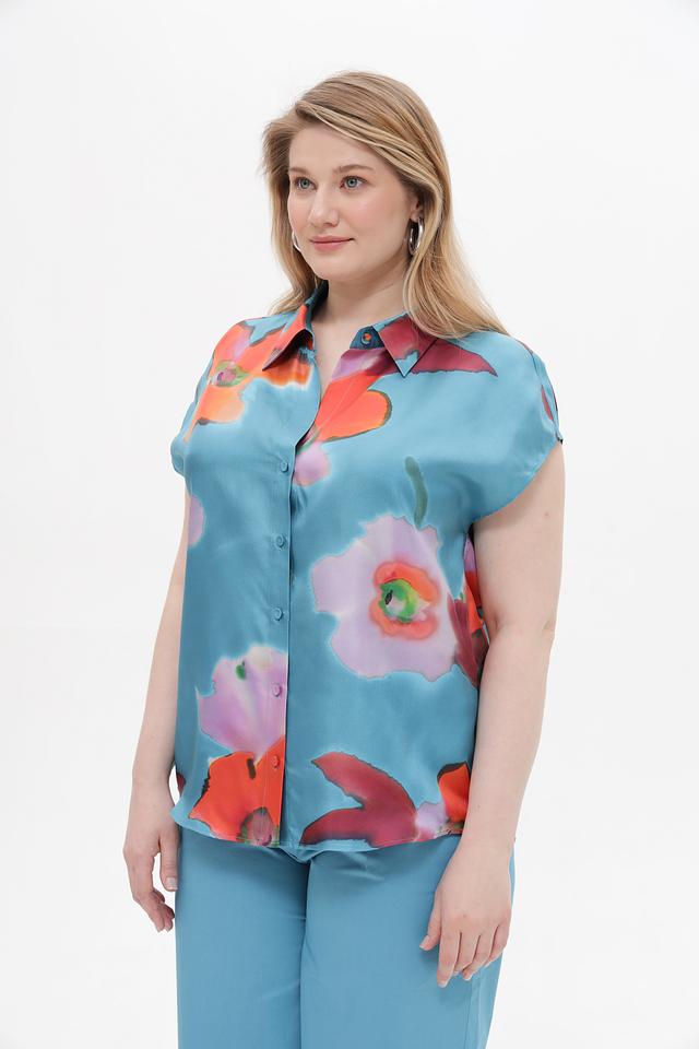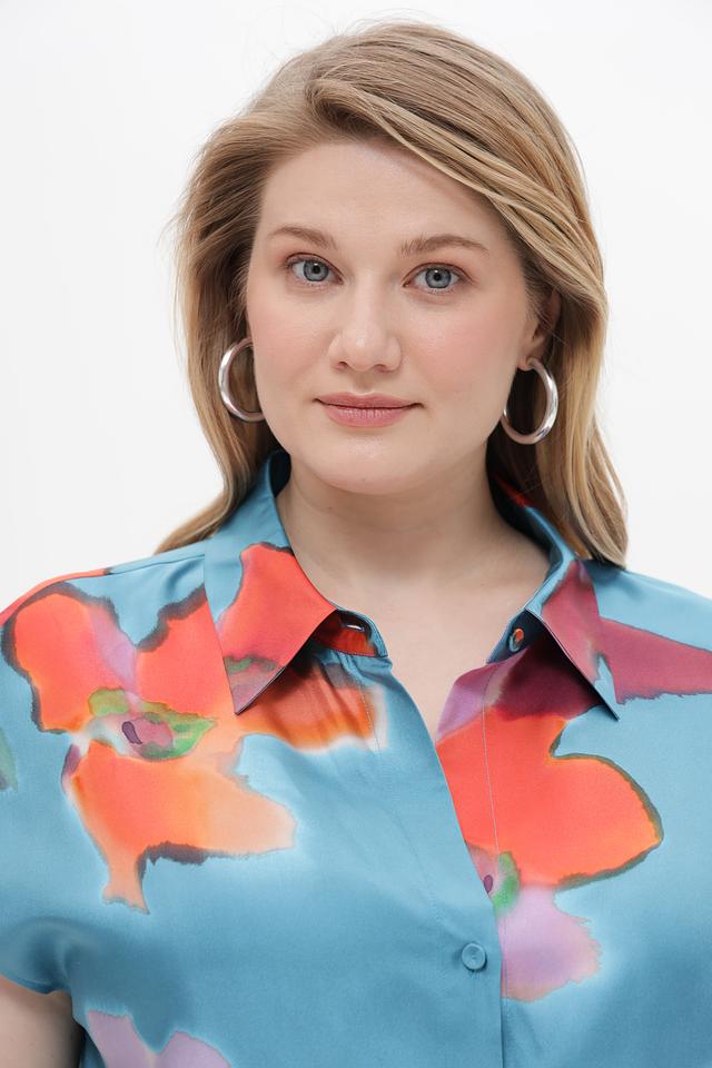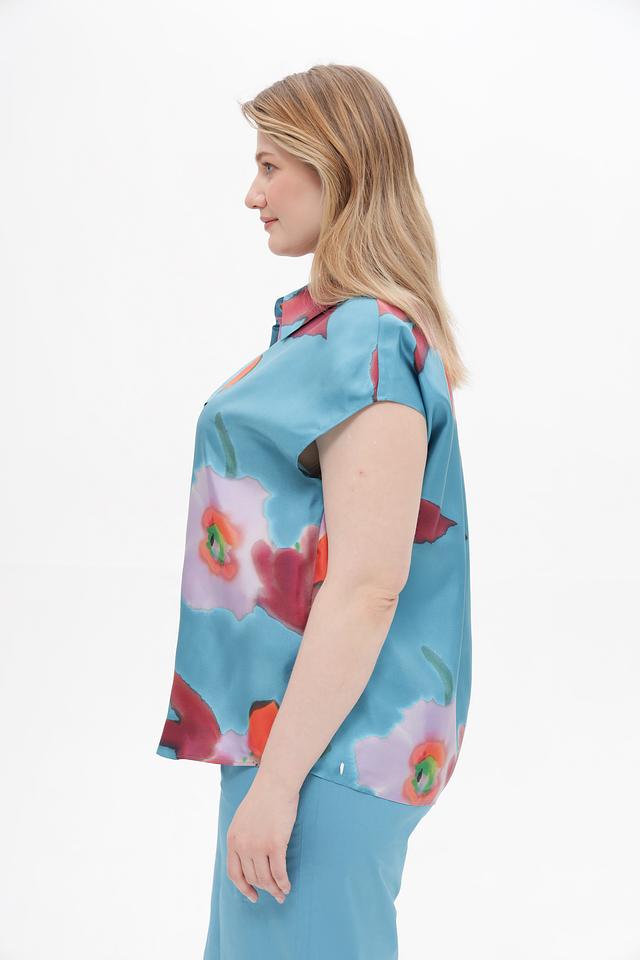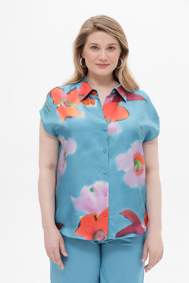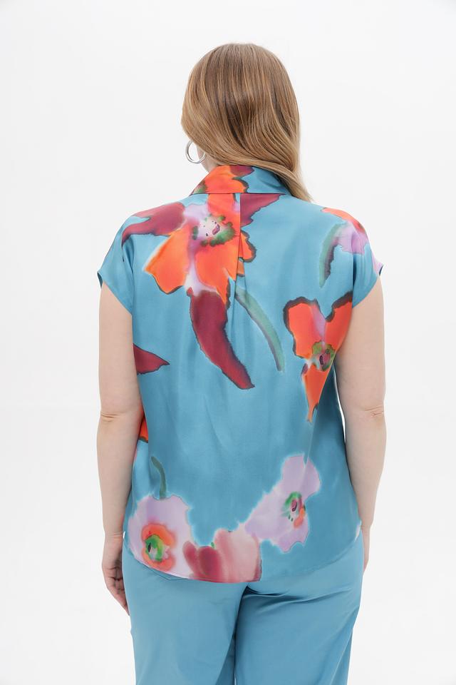 Блуза имеет прямой крой, короткие рукава и классический отложной воротник. Застежка на пуговицы по всей длине позволяет регулировать степень прилегания. Основной цвет блузы – бирюзовый, который служит прекрасным фоном для красочного цветочного принта.