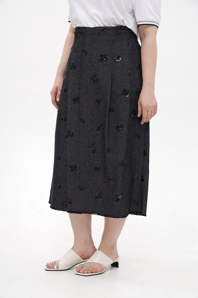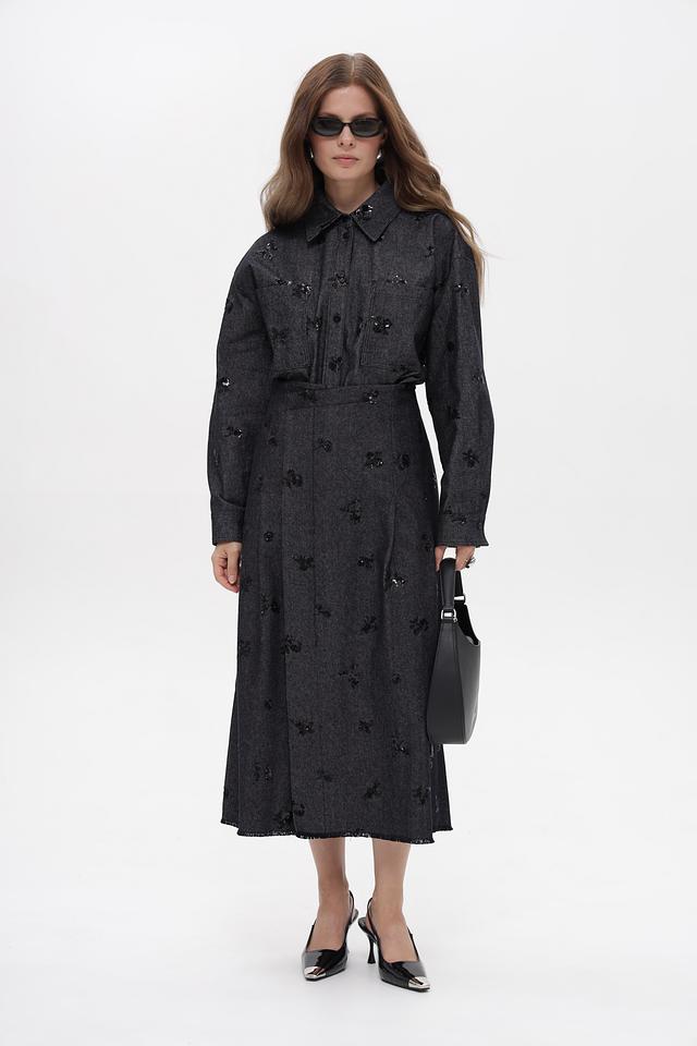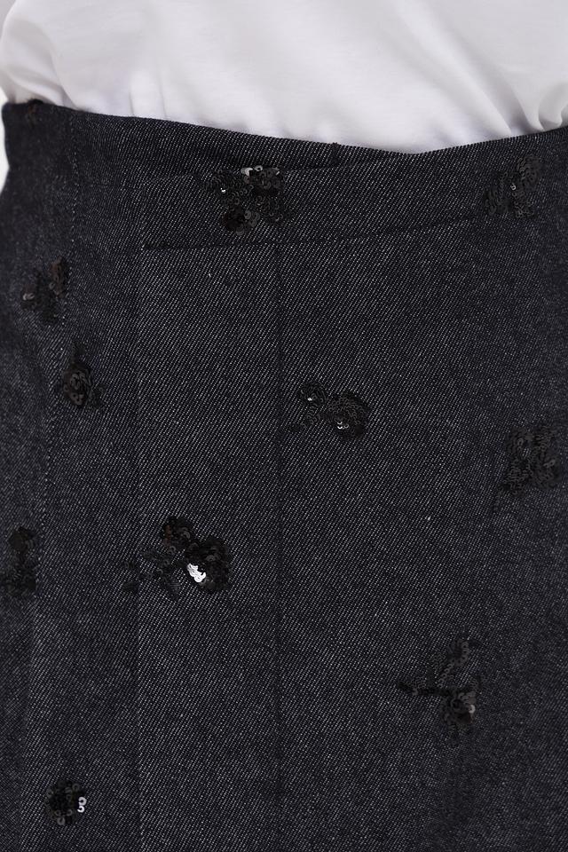 Представляем стильную юбку от бренда Luisa Cerano. Модель выполнена в сером цвете и декорирована узорами из вышивки.