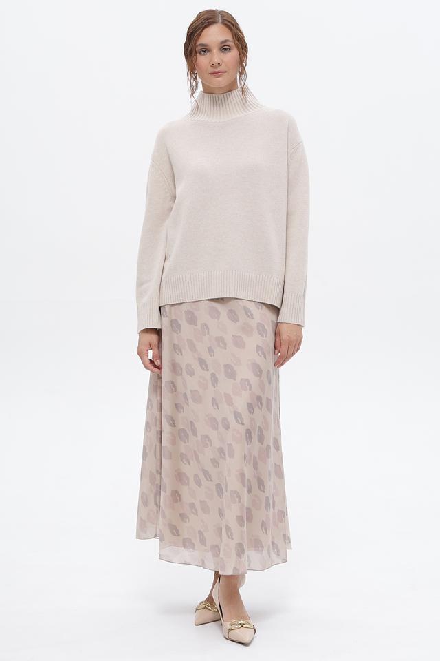 Пуловер имеет прямой крой и высокий горл, что придает ему изысканность и позволяет носить его как самостоятельный элемент, так и под верхнюю одежду.