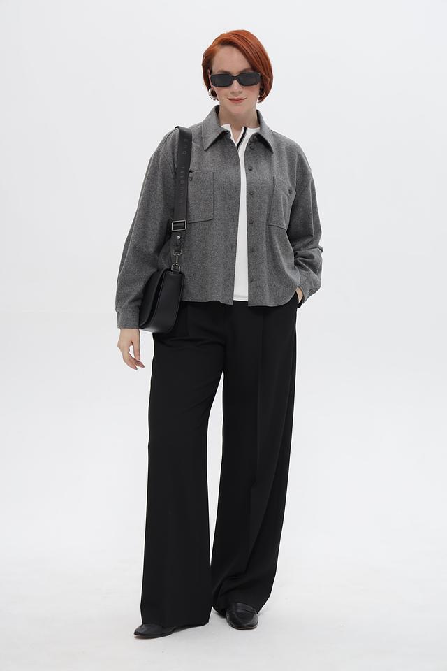 Жакет имеет классический крой, длинные рукава и застегивается на пуговицы. Накладные карманы добавляют практичности и непринужденности образу.