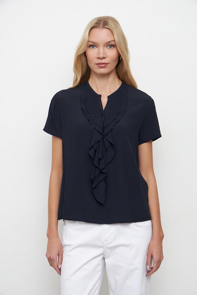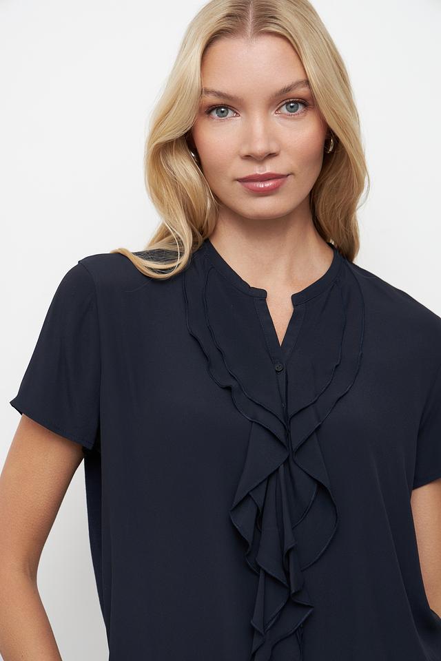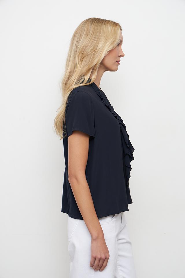 Блуза имеет воротник-стойку, украшенный многослойными рюшами, которые придают ей женственность и изысканность. Короткие рукава делают ее идеальным выбором для теплой погоды. Прямой крой обеспечивает комфортную посадку по фигуре.