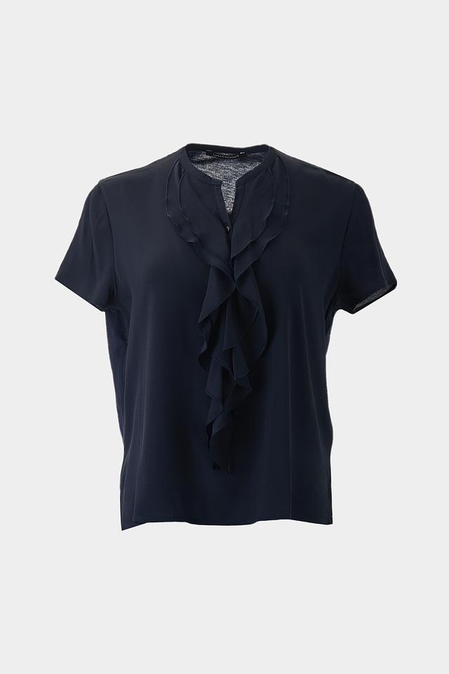 Стильная блуза Luisa Cerano темно-синего цвета с воротником-стойкой и декоративными рюшами. Изготовлена из шелковистого ацетата и натурального шелка, обеспечивающих комфорт и элегантный вид. Состав: ацетат 69%, шелк 31%