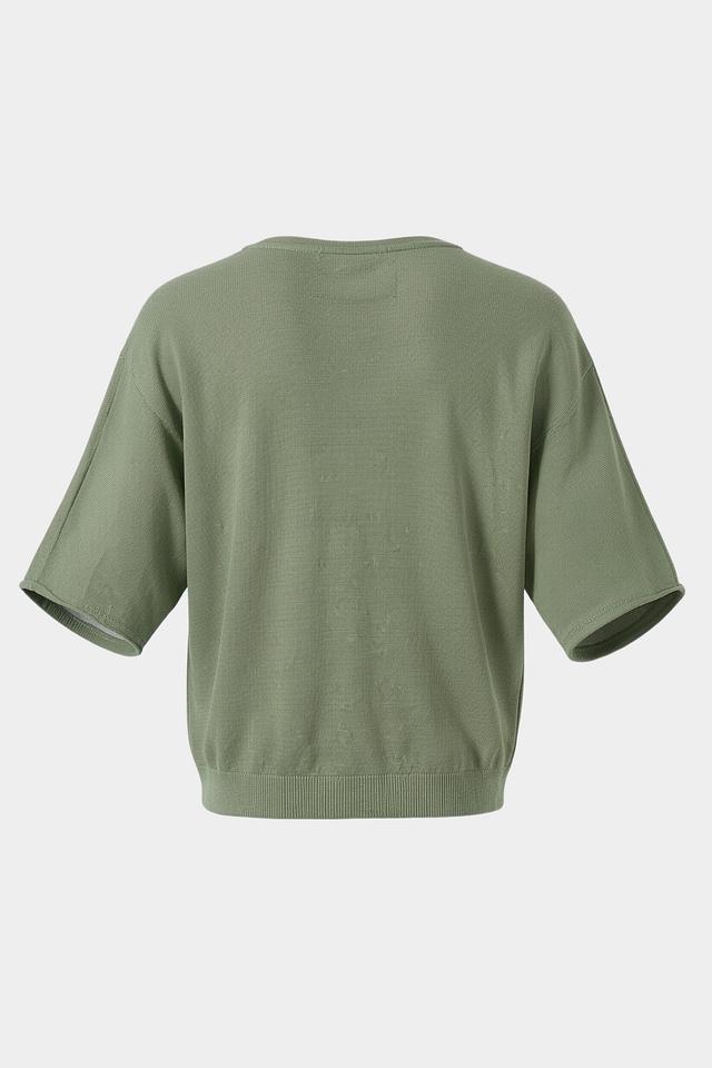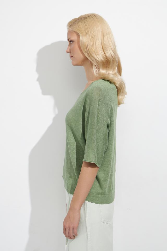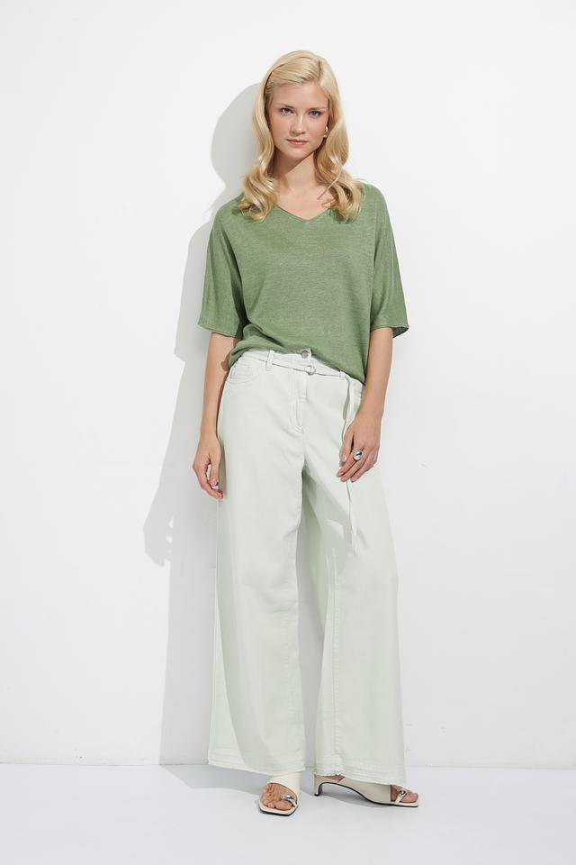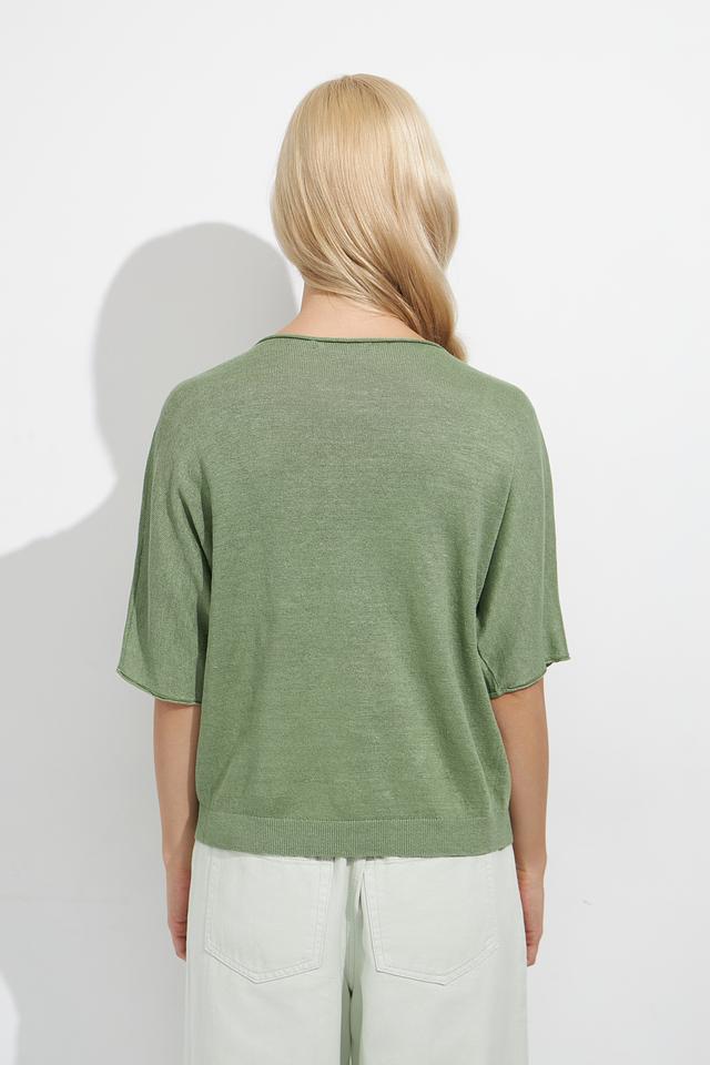Пуловер имеет прямой крой, V-образный вырез и короткие рукава, что делает его идеальным для теплых дней. Оливковый цвет добавляет образу свежести и натуральности.