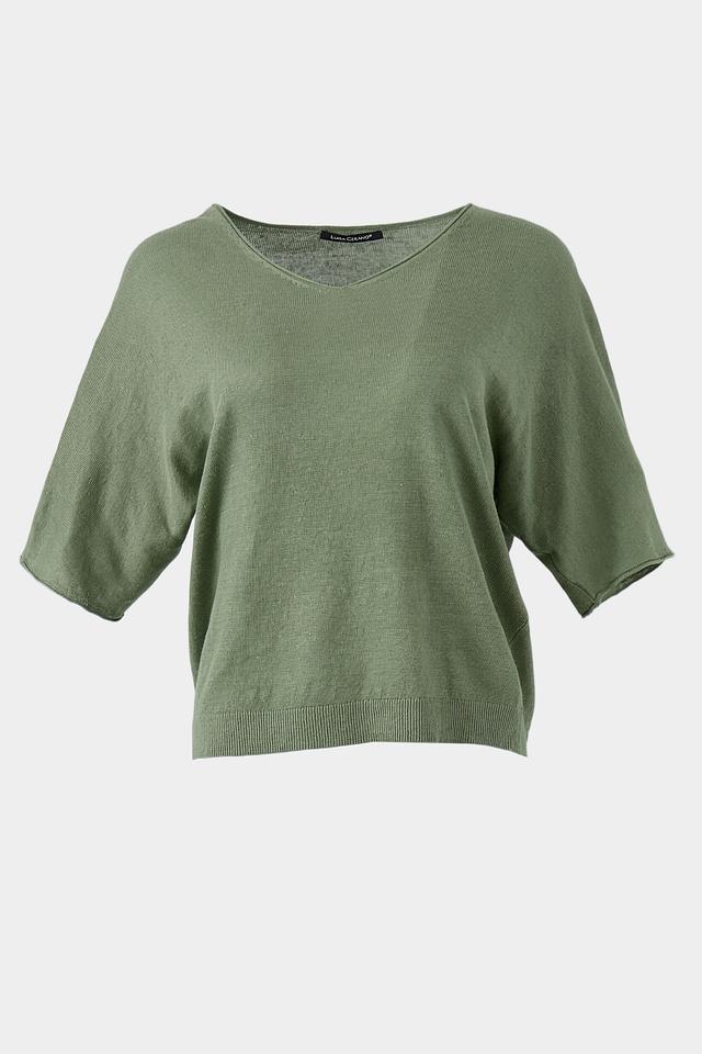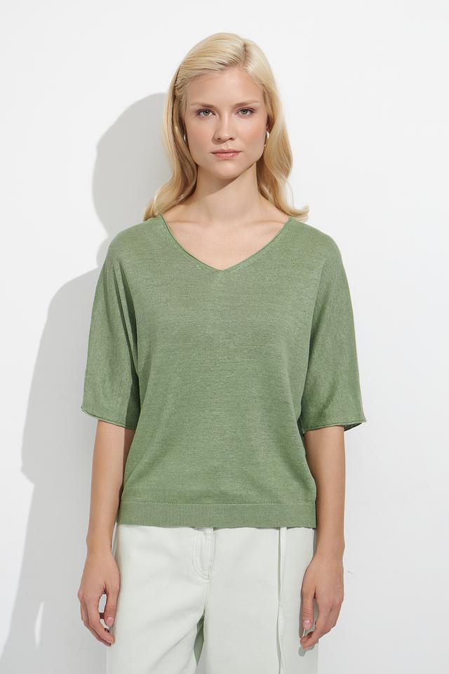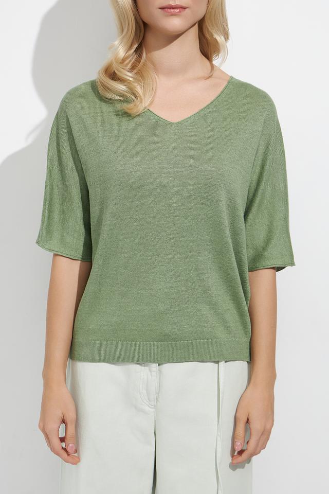 Женский пуловер Luisa Cerano оливкового цвета с V-образным вырезом и короткими рукавами. Изготовлен из 100% льна, что обеспечивает комфорт и воздухопроницаемость в жаркую погоду. Стильный и лаконичный дизайн. Состав: лен 100%