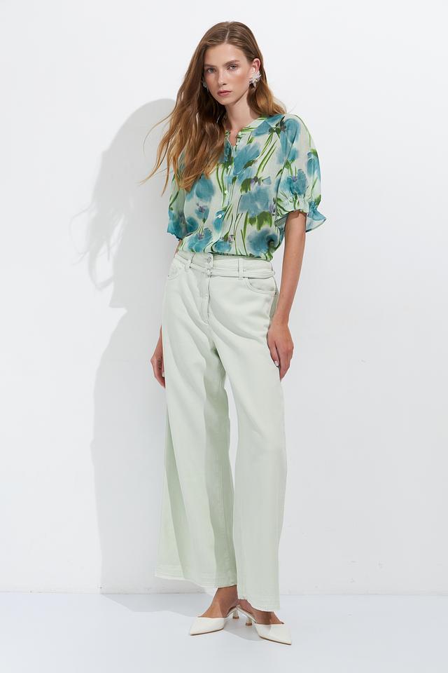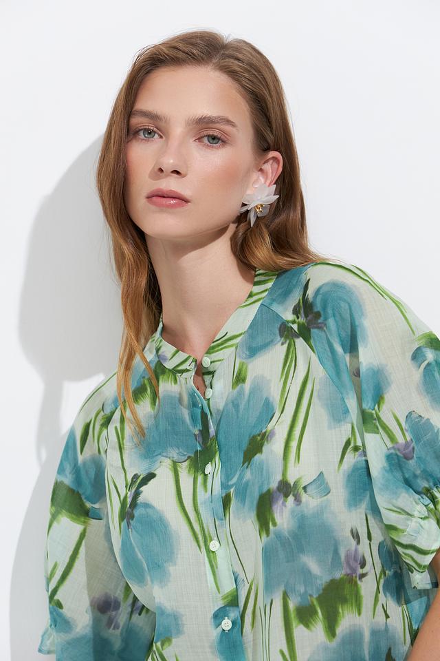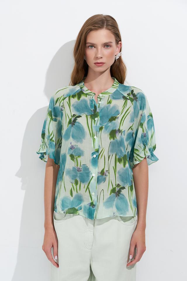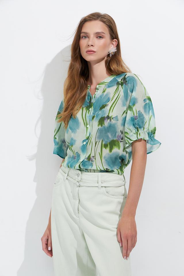 Блуза от Luisa Cerano светло-голубого цвета с ярким цветочным принтом. Модель выполнена из лёгкой ткани с короткими рукавами и V-образным вырезом, застёжка на пуговицы. Состав: луоселл 52%, рами 48%