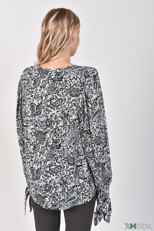 Особенностью данной блузы является её оригинальный принт, выполненный в чёрно-белой гамме. Небольшой вырез горловины придает образу лёгкость и женственность. Состав: 100% вискоза.