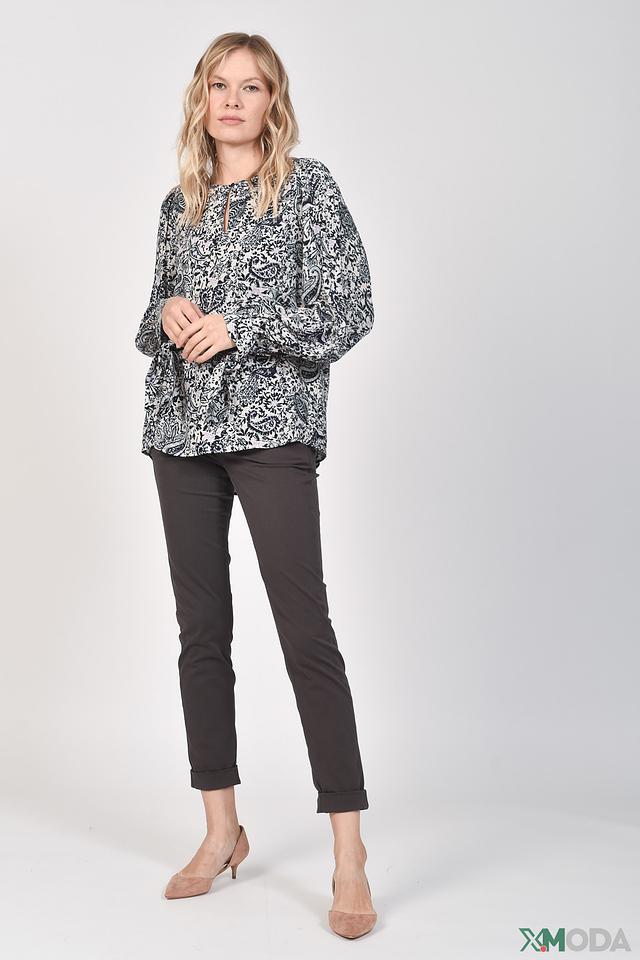 Блуза имеет свободный крой, который не сковывает движений и позволяет создать расслабленный, но при этом элегантный образ. Длинные рукава с манжетами на резинке добавляют модели изысканности.