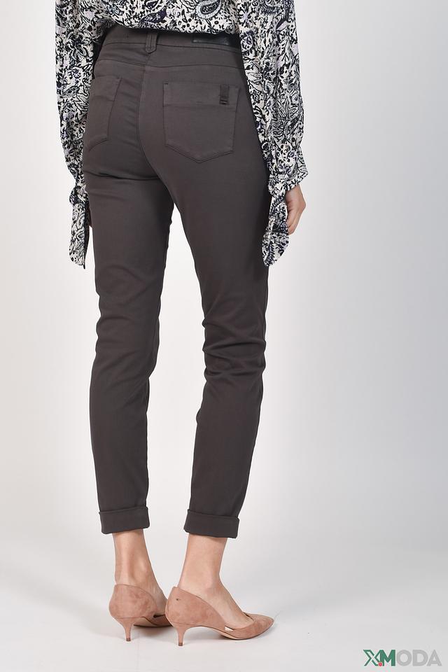 Брюки оснащены стандартной посадкой на талии, имеют боковые карманы и задние карманы с декоративной отделкой. Застежка – молния и пуговица.