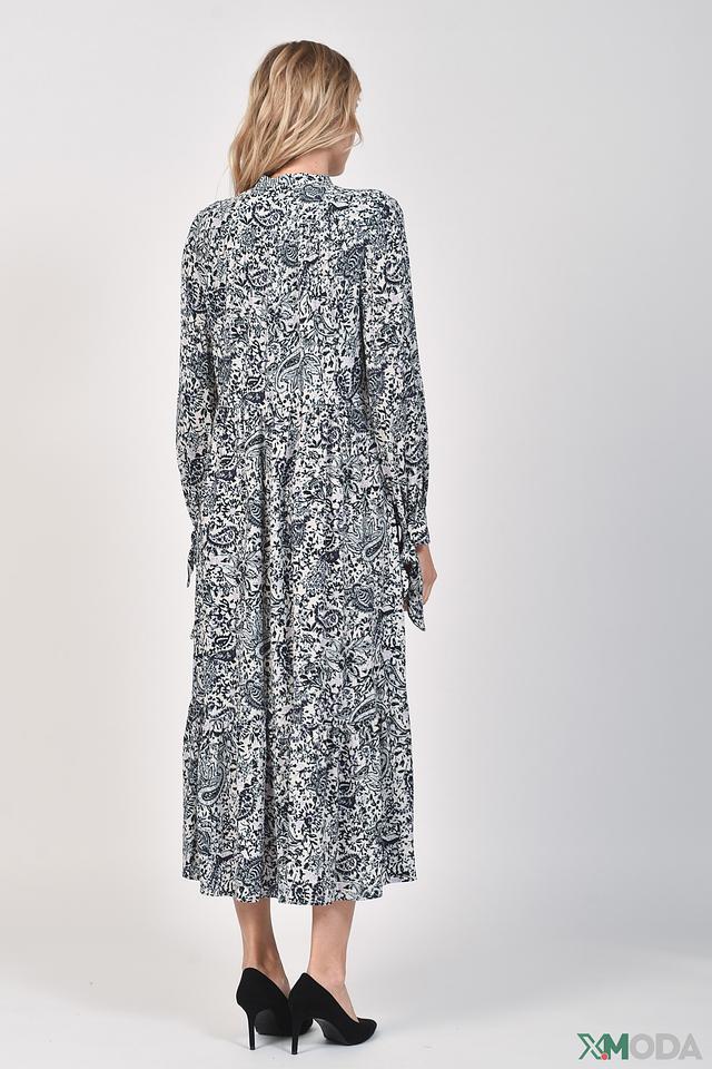 Платье имеет длинный рукав с манжетами, а также многоярусную юбку, которая придает ему легкость и воздушность. Высокий воротник-стойка добавляет изысканности. Данная модель идеально подойдет для создания как повседневных, так и вечерних образов.