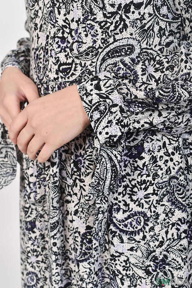 Основной цвет платья – слоновая кость, который служит идеальным фоном для яркого и оригинального цветочного принта. Принт выполнен в сочетании чёрного, синего и фиолетового цветов, создавая неповторимый и элегантный образ.
