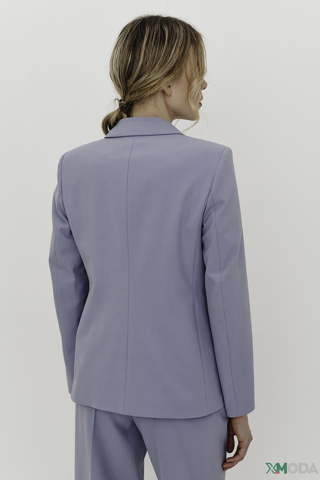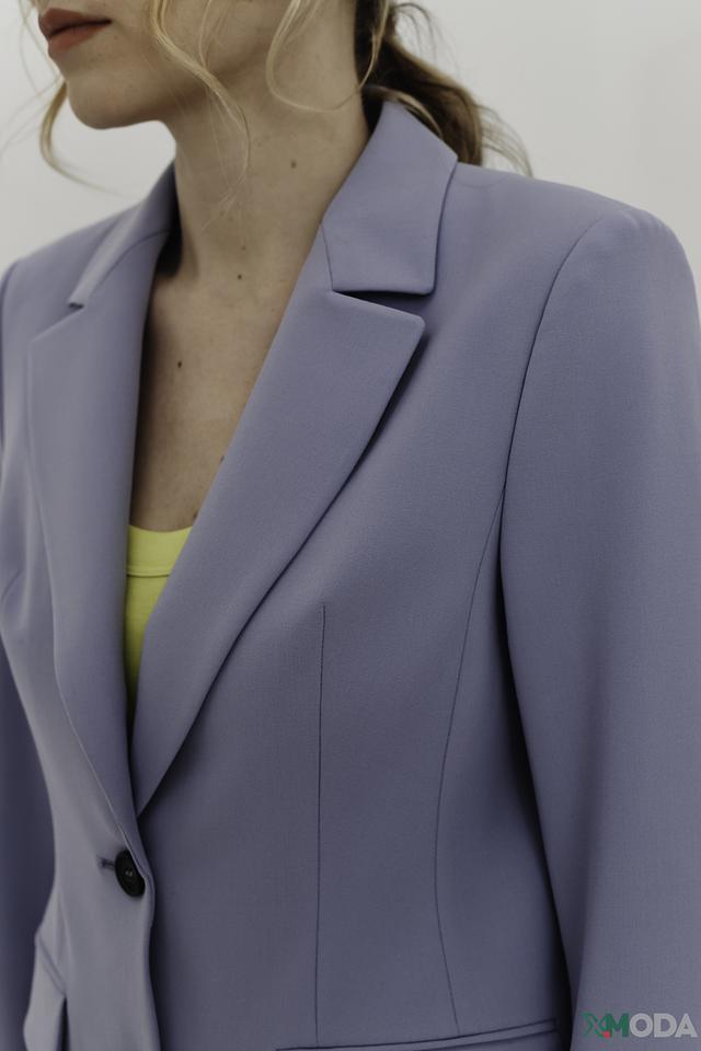 Жакет имеет приталенный силуэт, который подчеркивает фигуру, и двубортную застежку с двумя пуговицами. Классический лацкан добавляет образу элегантности и строгости. Жакет оснащен двумя функциональными карманами с клапанами.