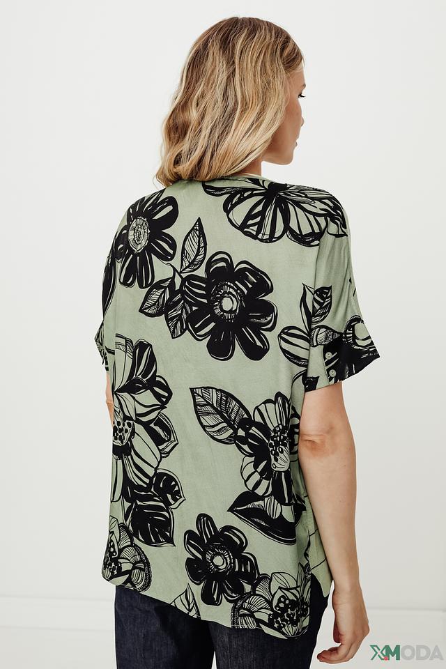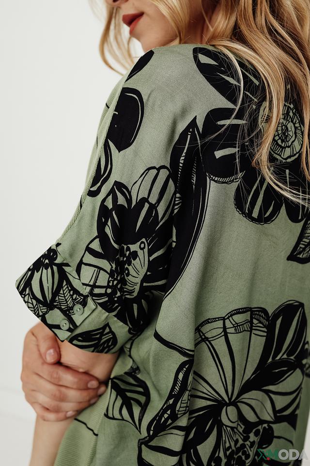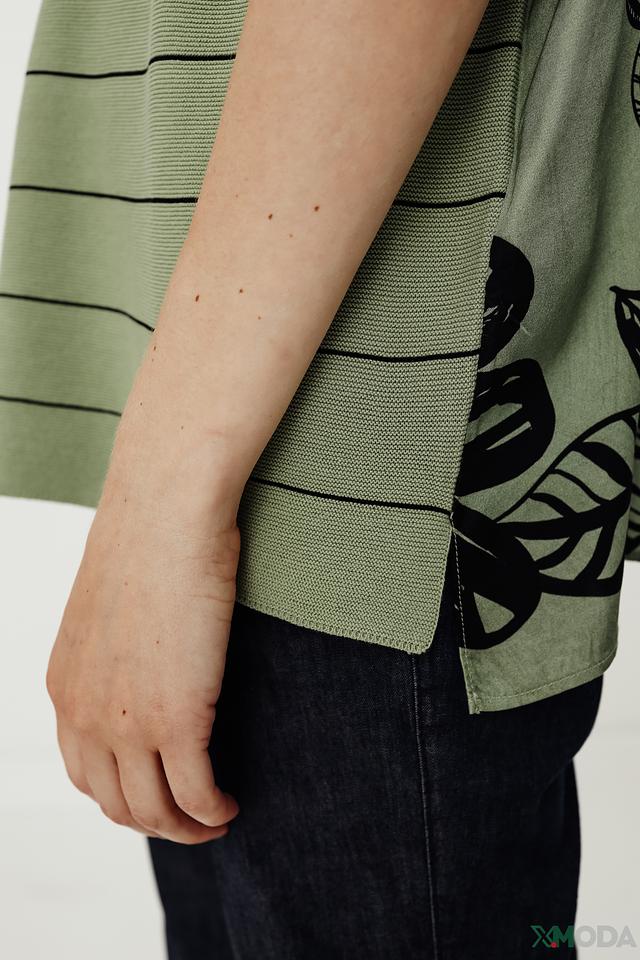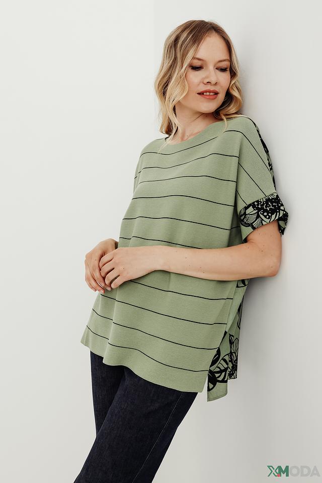 Особенностью модели являются короткие рукава с ярким цветочным принтом, который добавляет образу оригинальности и женственности. Пуловер имеет свободный крой, который обеспечивает комфорт и свободу движений.