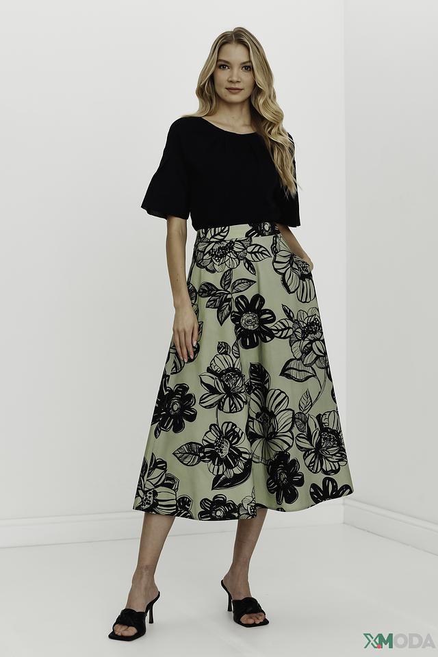 Эта юбка от Luisa Cerano – идеальный выбор для создания стильного и женственного образа. Выполнена в светло-зелёном цвете и украшена крупным цветочным принтом в чёрно-белой гамме, что придает ей особую выразительность.