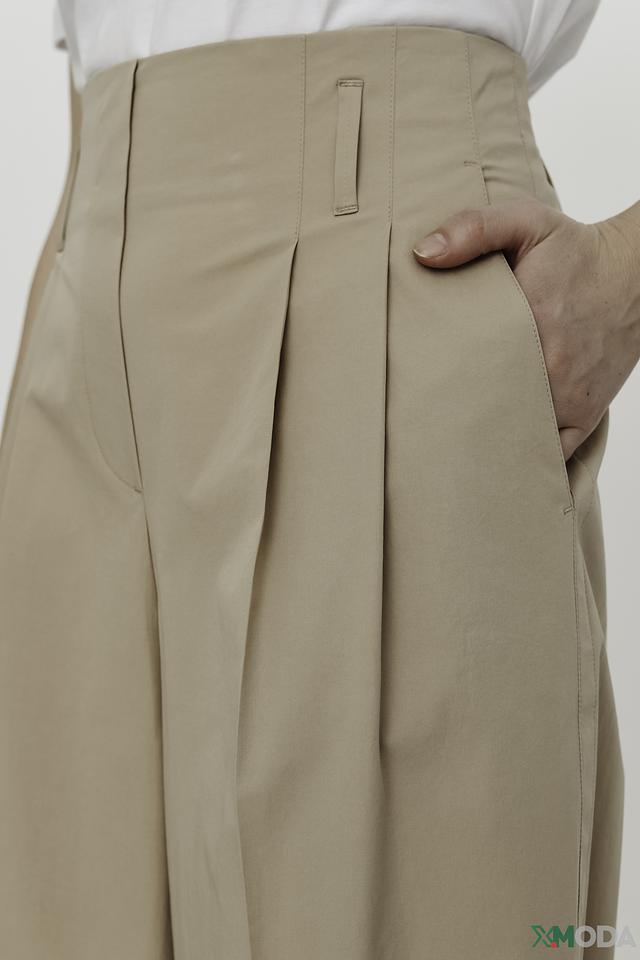Брюки имеют прямой крой и длину до середины икры, что делает их универсальными для создания как повседневных, так и более формальных образов. Высокая посадка визуально удлиняет ноги и подчеркивает талию. Спереди брюки украшены аккуратными складками, добавляющими им изысканности.