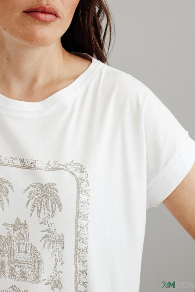 Модель имеет прямой крой и короткие рукава с небольшим подворотом, что придает ей непринужденный и современный вид. Особенностью данной футболки является оригинальный принт с изображением экзотического пейзажа, выполненный в приглушенных тонах.