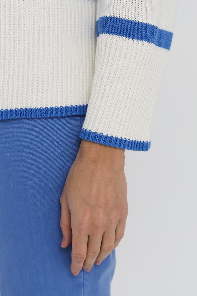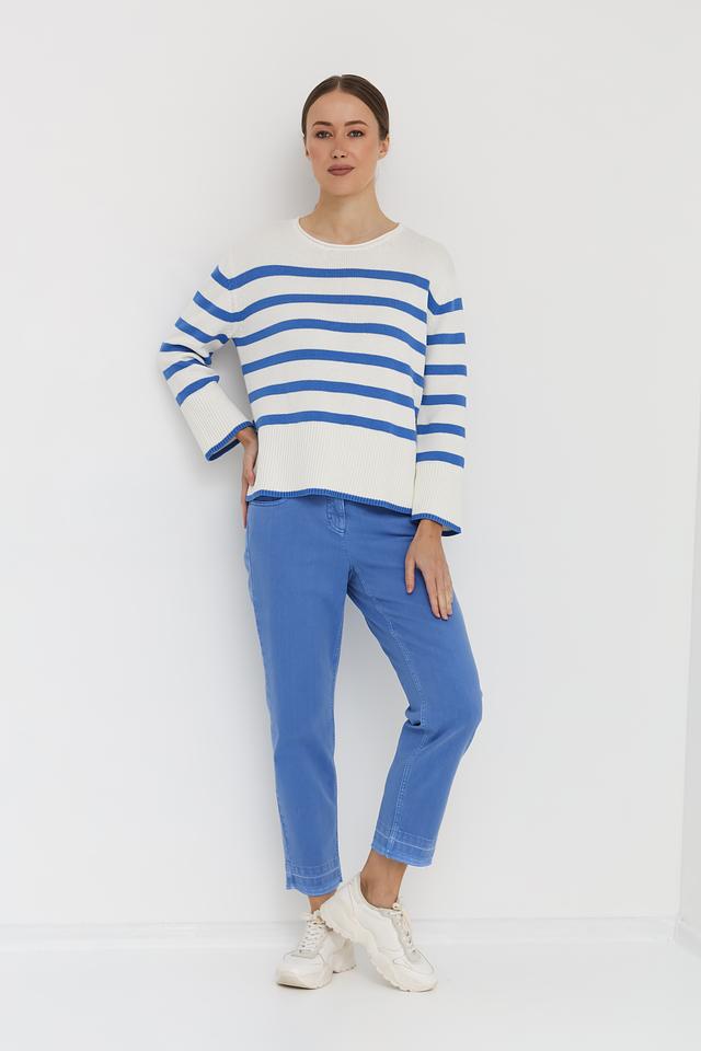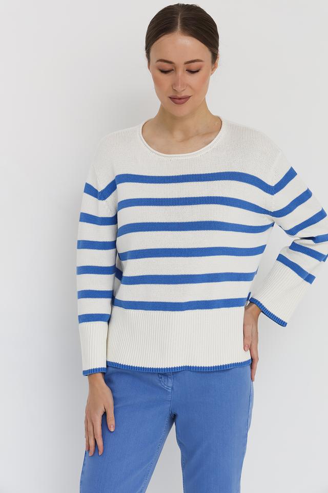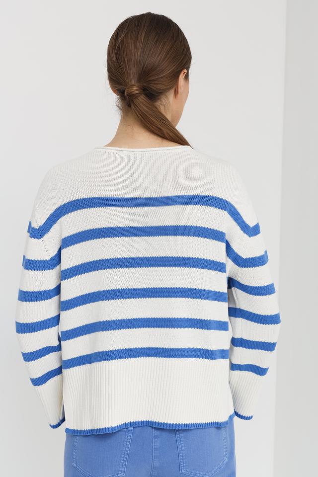 Женский пуловер Luisa Cerano сине-белого цвета, выполненный в классической полосатой расцветке. Модель имеет удобный круглый вырез горловины и длинные рукава с манжетами. Изготовлен из 100% хлопка, обеспечивающего комфорт и приятные ощущения при носке. Состав: хлопок 100%