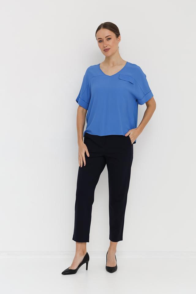 Блуза имеет V-образный вырез, который визуально удлиняет шею и подчеркивает линию декольте. Короткие рукава с манжетами добавляют образу изысканности. На груди расположился накладной карман, который придает блузе оригинальность.