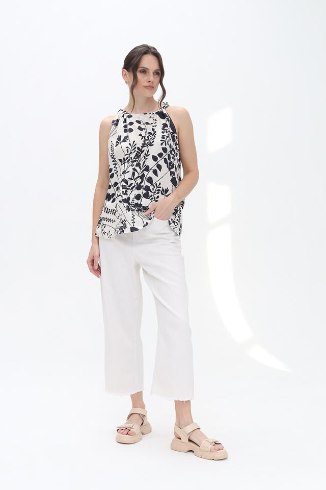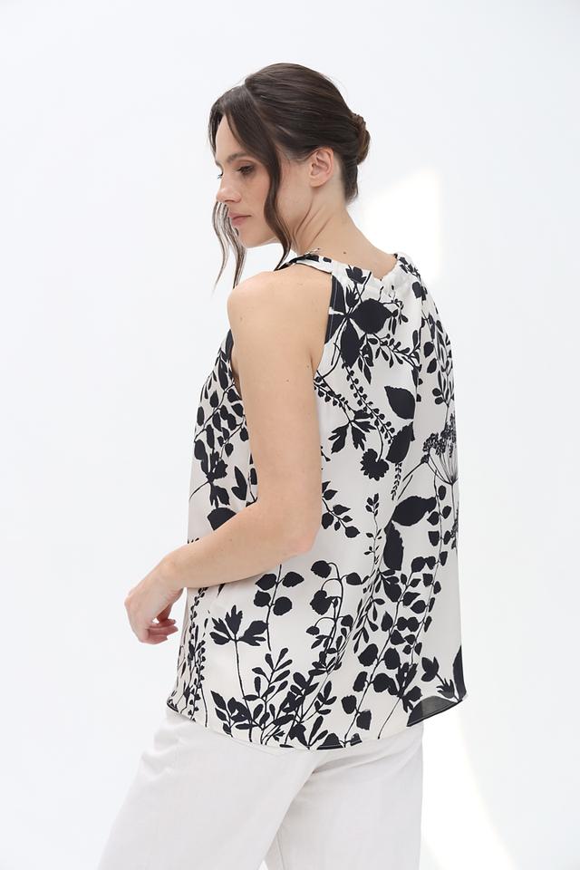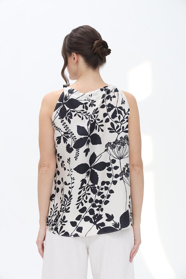Топ имеет свободный крой и круглый вырез, который подчеркивает женственность силуэта. Отличительной особенностью является яркий цветочный принт в чёрно-белой гамме, который делает этот топ уникальным и привлекательным.
