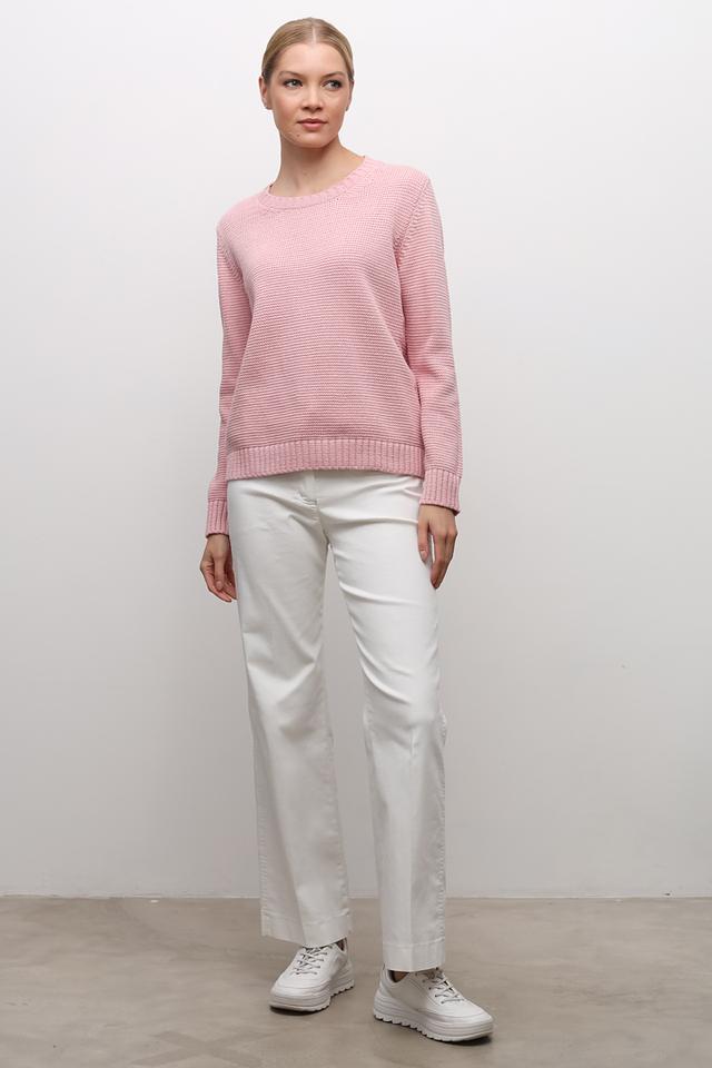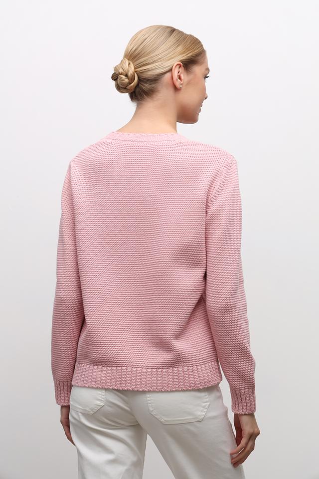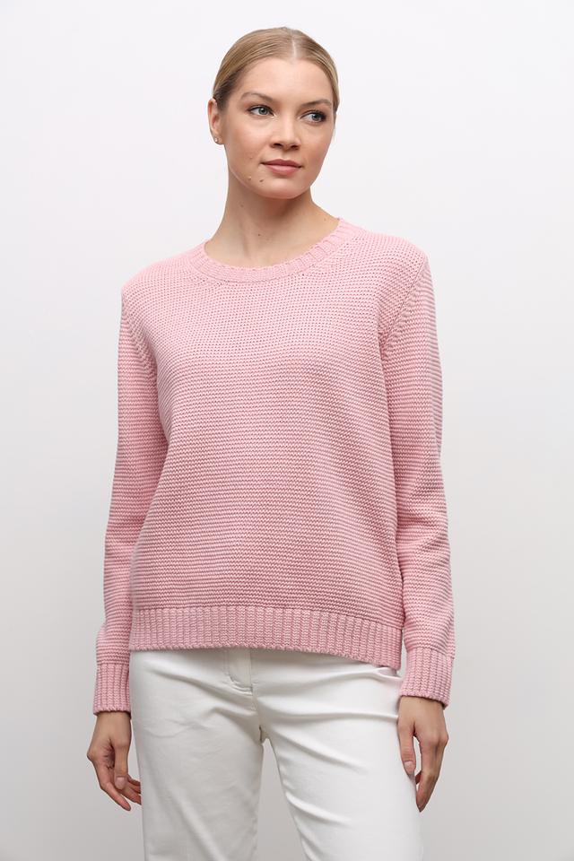 Пуловер имеет классический крой с круглым вырезом горловины и длинными рукавами. Фактурная вязка придает изделию объём и оригинальность. Нежный розовый цвет делает этот пуловер особенно женственным и привлекательным.
